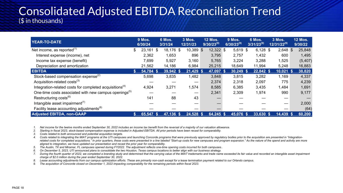 Consolidated Adjusted EBITDA Reconciliation Trend ($ in thousands) QUARTER-TO-DATE 3 Mos. 6/30/24 3 Mos. 3/31/24 3 Mos. 12/31/23 12 Mos. 9/30/23(9) 3 Mos. 9/30/23 3 Mos. 6/30/23 3 Mos. 3/31/23 3 Mos. 12/31/22(9) 12 Mos. 9/30/22 Net income (loss), as reported(1) $ 4,985 $ 7,787 $ 10,389 $ 12,322 $ 6,703 $ (509) $ 3,480 $ 2,648 $ 25,848 Interest expense (income), net 709 757 896 3,795 1,038 1,325 832 600 1,495 Income tax expense (benefit) 1,772 2,767 3,160 5,765 2,541 (64) 1,763 1,525 (5,407) Depreciation and amortization 7,376 7,202 6,984 25,215 6,566 6,655 6,746 5,248 16,884 EBITDA $ 14,842 $ 18,513 $ 21,429 $ 47,097 $ 16,848 $ 7,407 $ 12,821 $ 10,021 $ 38,820 Stock-based compensation expense(2) 1,863 2,353 1,482 3,848 33 533 2,113 1,169 4,337 Acquisition-related costs(3) — — — 2,374 56 221 1,322 775 4,239 Integration-related costs for completed acquisitions(4) 1,653 1,696 1,574 8,585 2,200 2,950 1,951 1,484 1,691 One-time costs associated with new campus openings(5) — — — 2,341 32 335 984 990 9,177 Restructuring costs(6) 53 45 43 — — — — — — Intangible asset impairment(7) — — — — — — — — 2,000 Facility lease accounting adjustments(8) — — — — — — — — (64) Adjusted EBITDA, non-GAAP $ 18,411 $ 22,607 $ 24,528 $ 64,245 $ 19,169 $ 11,446 $ 19,191 $ 14,439 $ 60,200 PAGE 17 1. Net income for the twelve months ended September 30, 2022 includes an income tax benefit from the reversal of a majority of our valuation allowance. 2. Starting in fiscal 2023, stock-based compensation expense is included in Adjusted EBITDA. All prior periods have been recast for comparability. 3. Costs related to both announced and potential acquisition targets. 4. Costs related to integrating the MIAT programs at the UTI campuses and launching Concorde programs that were previously approved by regulatory bodies prior to the acquisition are presented in “Integration-related costs for completed acquisitions.” In prior quarters, these costs were presented in a line labeled “Start-up costs for new campuses and program expansion.” As the nature of the spend and activity are more aligned to integration, we have updated our presentation and recast the prior year for comparability. 5. The Austin, TX and Miramar, FL campuses opened during FY2022. The adjustment reflects one-time opening costs incurred for both campuses. 6. On December 5, 2023, UTI announced plans to consolidate the two Houston, Texas campus locations to better align with our business strategy. 7. During the fourth quarter of 2022, we completed a branding study and determined that the carrying value of the MIAT trademarks and trade name exceeded its fair value and recorded an intangible asset impairment charge of $2.0 million during the year ended September 30, 2022. 8. Lease accounting adjustments from our campus optimization efforts. These are primarily non-cash except for a lease termination payment related to our Orlando campus. 9. The acquisition of Concorde closed on December 1, 2022. As such, the three months ended December 31, 2022 and the twelve months ended September 30, 2023 only includes one and ten months of Concorde activity, respectively.
