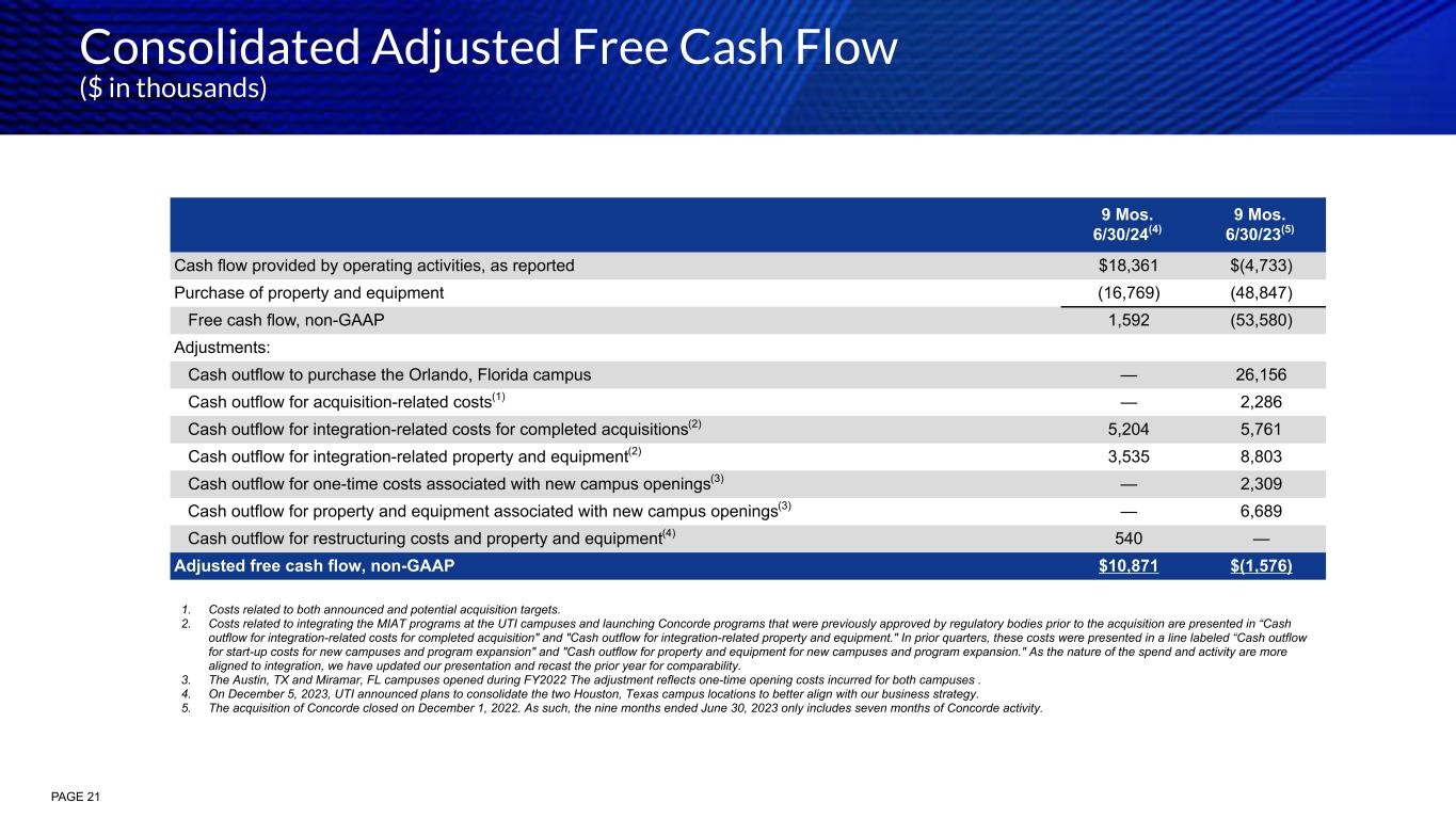 Adjusted EBITDA Reconciliation By Segment ($ in thousands) YEAR-TO-DATE 9 Mos. 6/30/24 9 Mos. 6/30/24 9 Mos. 6/30/24 9 Mos. 6/30/23 9 Mos. 6/30/23(1) 9 Mos. 6/30/23 UTI Concorde Corporate UTI Concorde Corporate Net income (loss), as reported $ 42,886 $ 14,271 $ (33,996) $ 25,277 $ 7,531 $ (27,189) Interest expense (income), net 4,446 (181) (1,903) 3,214 (128) (329) Income tax expense (benefit) — — 7,699 — — 3,224 Depreciation and amortization 16,921 3,738 903 14,990 3,637 22 EBITDA $ 64,253 $ 17,828 $ (27,297) $ 33,275 $ 7,568 $ (18,001) Stock-based compensation expense(2) 1,300 133 4,265 1,176 — 2,639 Acquisition-related costs(3) — — — — — 2,318 Integration-related costs for completed acquisitions(4) 964 2,072 1,888 3,138 1,267 1,980 One-time costs associated with new campus openings(5) — — — 2,309 — — Restructuring costs(6) 141 — — — — — Adjusted EBITDA, non-GAAP $ 66,658 $ 20,033 $ (21,144) $ 39,898 $ 8,835 $ (11,064) PAGE 20 1. The acquisition of Concorde closed on December 1, 2022. As such, the nine months ended June 30, 2023 only includes seven months of Concorde activity. 2. Starting in FY2023, stock-based compensation expense is included in Adjusted EBITDA. All prior periods have been recast for comparability. 3. Costs related to both announced and potential acquisition targets 4. Costs related to integrating the MIAT programs at the UTI campuses and launching Concorde programs that were previously approved by regulatory bodies prior to the acquisition are presented in “Integration-related costs for completed acquisitions.” In prior quarters, these costs were presented in a line labeled “Start-up costs for new campuses and program expansion.” As the nature of the spend and activity are more aligned to integration, we have updated our presentation and recast the prior year for comparability. 5. The Austin, TX and Miramar, FL campuses opened during FY2022. The adjustment reflects one-time opening costs incurred for both campuses.. 6. On December 5, 2023, UTI announced plans to consolidate the two Houston, Texas campus locations to better align with our business strategy.