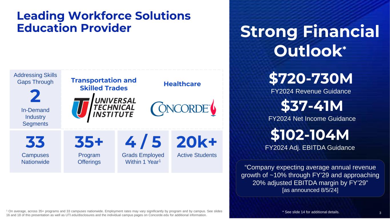 2 Forward-Looking Statements This presentation contains forward-looking statements within the meaning of the safe harbor from civil liability provided for such statements by the Private Securities Litigation Reform Act of 1995 (set forth in Section 27A of the Securities Act of 1933, as amended, and Section 21E of the Securities Exchange Act of 1934, as amended). Forward-looking statements may contain words such as "goal," "target," "future," "estimate," "expect," "anticipate," "intend," "plan," "believe," "seek," "project," "may," "should," "will," the negative form of these expressions or similar expressions. These statements are based on our management’s current beliefs, expectations and assumptions about future events, conditions and results and on information currently available to us. Although we believe that the expectations reflected in the forward-looking statements are reasonable, we cannot guarantee future results, levels of activity, performance, achievements or events and circumstances reflected in the forward-looking statements will occur. Discussions containing these forward-looking statements may be found, among other places, in the Sections entitled “Business,” “Risk Factors” and “Management’s Discussion and Analysis of Financial Condition and Results of Operations” incorporated by reference from our most recent Annual Report on Form 10-K, in our subsequent Quarterly Reports on Form 10-Q and certain of our current reports on Form 8-K, as well as any amendments thereto, filed with the Securities and Exchange Commission (the “SEC”). In addition, statements that refer to projections of earnings, revenue, costs or other financial items in future periods; anticipated growth and trends in our business or key markets; cost synergies, growth opportunities and other potential financial and operating benefits; future growth and revenues; future economic conditions and performance; anticipated performance of curriculum; plans, objectives and strategies for future operations; and other characterizations of future events or circumstances, and all other statements that are not statements of historical fact are forward-looking statements. Such statements are based on currently available operating, financial and competitive information and are subject to various risks, uncertainties and assumptions that could cause actual results to differ materially from those anticipated or implied in our forward-looking statements due to a number of factors, including, but not limited to, those set forth under the section entitled “Risk Factors” in our filings with the SEC. Factors that might cause such a difference include, but are not limited to, failure of our schools to comply with the extensive regulatory requirements for school operations; our failure to maintain eligibility for federal student financial assistance funds; the effect of current and future Title IV Program regulations arising out of negotiated rulemakings, including any potential reductions in funding or restrictions on the use of funds received through Title IV Programs; the effect of future legislative or regulatory initiatives related to veterans’ benefit programs; continued Congressional examination of the for-profit education sector; our failure to maintain eligibility for or the ability to process federal student financial assistance; regulatory investigations of, or actions commenced against, us or other companies in our industry; changes in the state regulatory environment or budgetary constraints; our failure to execute on our growth and diversification strategy, including effectively identifying, establishing and operating additional schools, programs or campuses; our failure to realize the expected benefits of our acquisitions, or our failure to successfully integrate our acquisitions; our failure to improve underutilized capacity at certain of our campuses; enrollment declines or challenges in our students’ ability to find employment as a result of macroeconomic conditions; our failure to maintain and expand existing industry relationships and develop new industry relationships; our ability to update and expand the content of existing programs and develop and integrate new programs in a timely and cost-effective manner while maintaining positive student outcomes; a loss of our senior management or other key employees; failure to comply with the restrictive covenants and our ability to pay the amounts when due under the Credit Agreement; the effect of our principal stockholder owning a significant percentage of our capital stock, and thus being able to influence certain corporate matters and the potential in the future to gain substantial control over our company; the effect of public health pandemics, epidemics or outbreak, including COVID-19, and other risks that are described from time to time in our filings with the SEC. Given these risks, uncertainties and other factors, many of which are beyond our control, you should not place undue reliance on these forward-looking statements. Neither we nor any other person makes any representation as to the accuracy or completeness of these forward-looking statements and, except as required by law, we assume no obligation to update these forward-looking statements publicly, or to revise any forward-looking statements, even if new information becomes available in the future. This presentation also contains estimates and other statistical data made by independent parties, and by us, relating to market size and growth and other data about our industry and our business. This data involves several assumptions and limitations, and you are cautioned not to give undue weight to such estimates. In addition, projections, assumptions and estimates of our future performance and the future performance of the markets in which we operate are necessarily subject to a high degree of uncertainty and risk.
