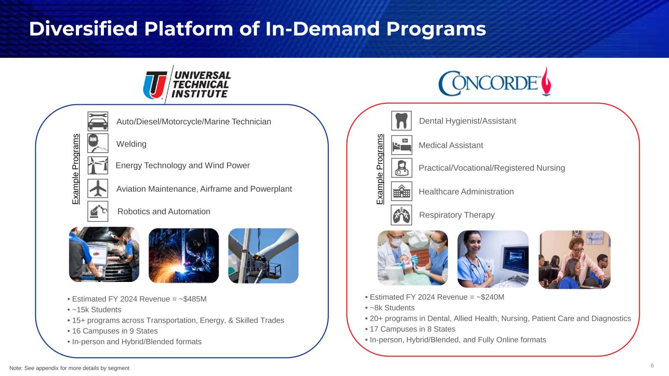5 Compelling Ongoing Investment Thesis 1 Per recent years’ accreditor reporting results. See slides 16 and 18 in this presentation as well as uti.edu/disclosures and the individual campus pages on concorde.edu for additional information. Leading educational platforms serving critical, in-demand markets with favorable long-term trends Strong student outcomes1 and positive regulatory metrics driven by enterprise-wide emphasis on our students Consistently meeting or exceeding expectations while executing on a repeatable and scalable growth strategy Successful and ongoing transformation efforts supporting optimized operating model and margin expansion Healthy balance sheet and disciplined capital allocation plan driving continued growth and shareholder value creation Universal Technical Institute, Inc.
