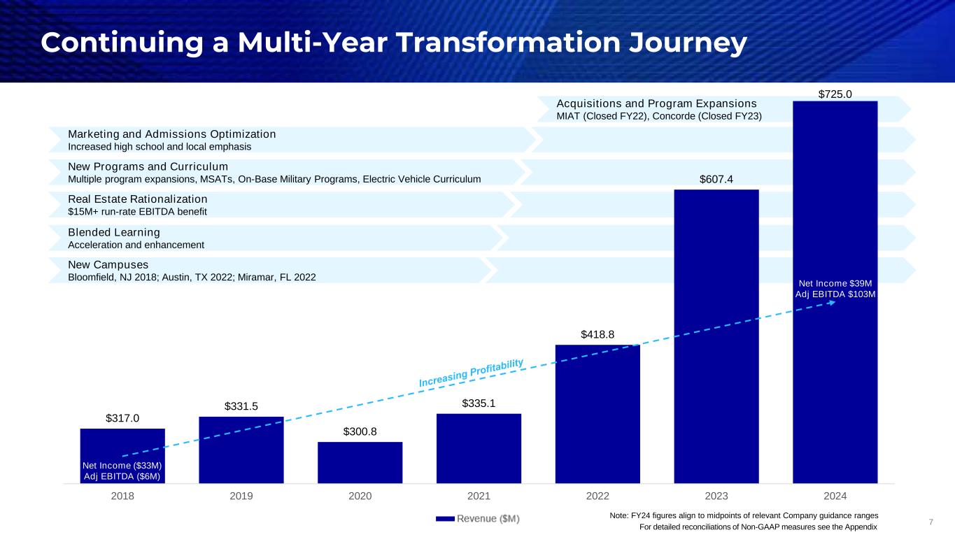 6 Diversified Platform of In-Demand Programs Practical/Vocational/Registered Nursing Dental Hygienist/Assistant Healthcare Administration Medical Assistant Respiratory TherapyRobotics and Automation Welding Auto/Diesel/Motorcycle/Marine Technician Aviation Maintenance, Airframe and Powerplant Energy Technology and Wind Power • Estimated FY 2024 Revenue = ~$485M • ~15k Students • 15+ programs across Transportation, Energy, & Skilled Trades • 16 Campuses in 9 States • In-person and Hybrid/Blended formats • Estimated FY 2024 Revenue = ~$240M • ~8k Students • 20+ programs in Dental, Allied Health, Nursing, Patient Care and Diagnostics • 17 Campuses in 8 States • In-person, Hybrid/Blended, and Fully Online formats Ex am pl e Pr og ra m s Ex am pl e Pr og ra m s Note: See appendix for more details by segment