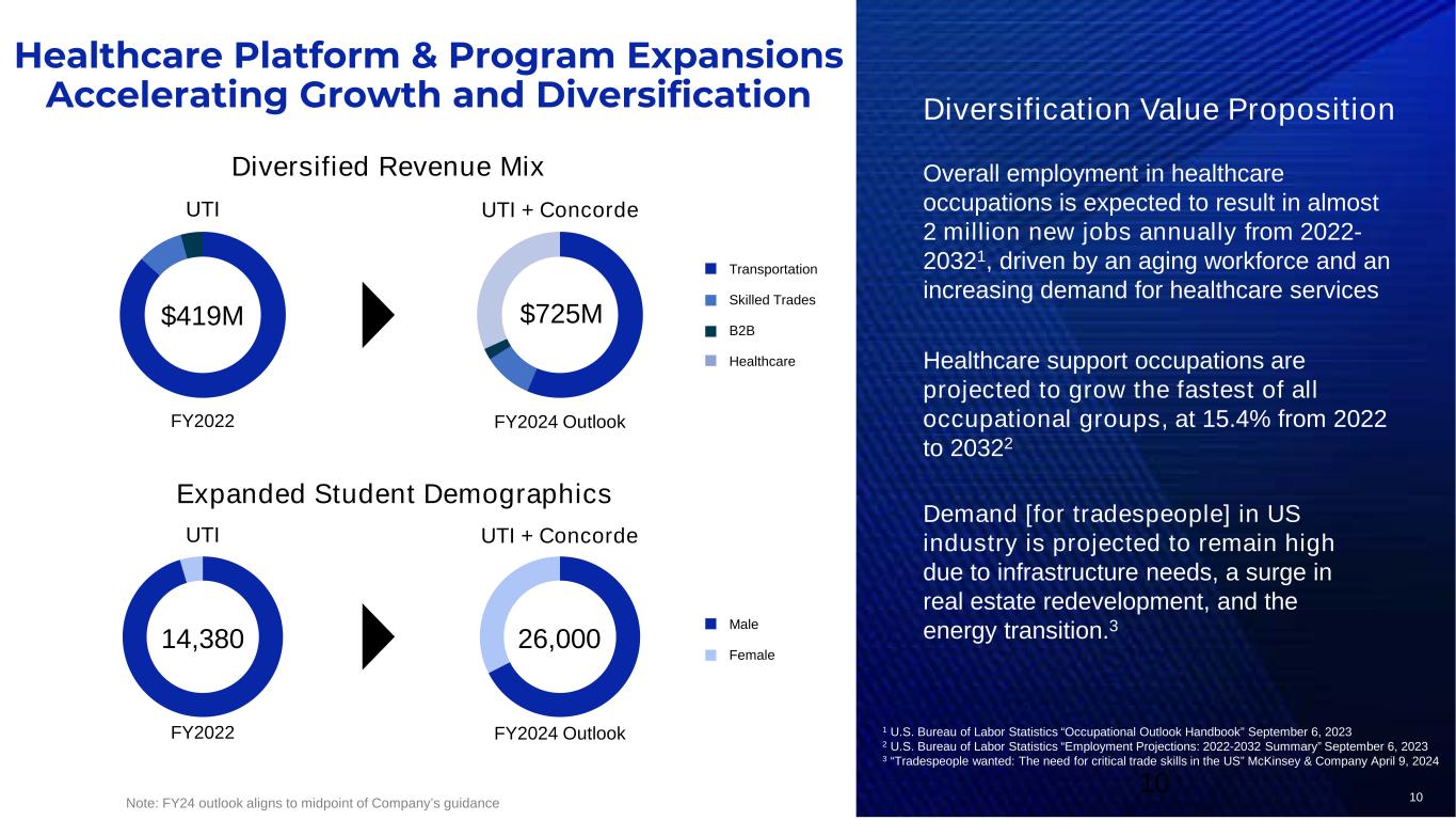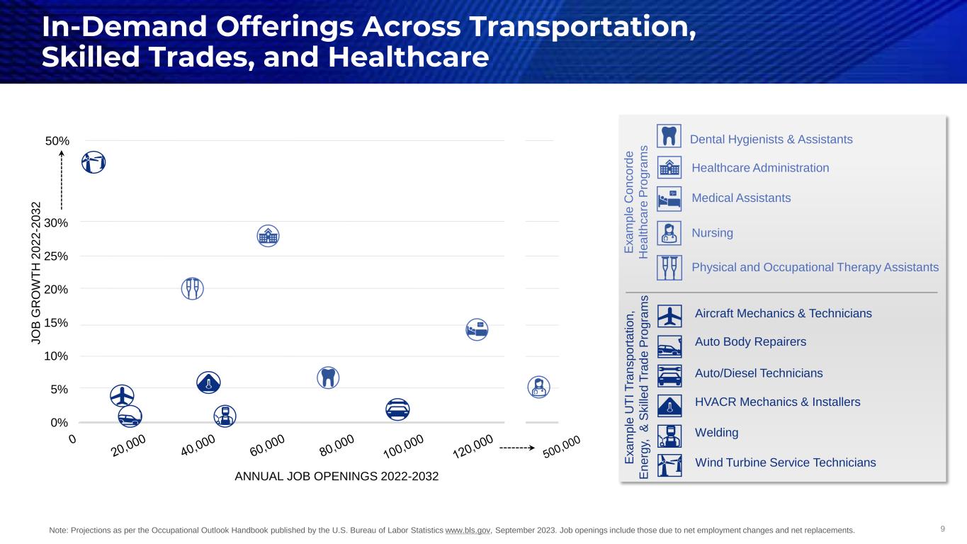 9 0% 5% 10% 15% 20% 25% 30% JO B G R O W TH 2 02 2- 20 32 ANNUAL JOB OPENINGS 2022-2032 In-Demand Offerings Across Transportation, Skilled Trades, and Healthcare 50% Nursing Dental Hygienists & Assistants Physical and Occupational Therapy Assistants Healthcare Administration Medical Assistants Ex am pl e C on co rd e H ea lth ca re P ro gr am s Ex am pl e U TI T ra ns po rta tio n, En er gy , & Sk ille d Tr ad e Pr og ra m s Wind Turbine Service Technicians Aircraft Mechanics & Technicians Welding HVACR Mechanics & Installers Auto Body Repairers Auto/Diesel Technicians Note: Projections as per the Occupational Outlook Handbook published by the U.S. Bureau of Labor Statistics www.bls.gov, September 2023. Job openings include those due to net employment changes and net replacements.