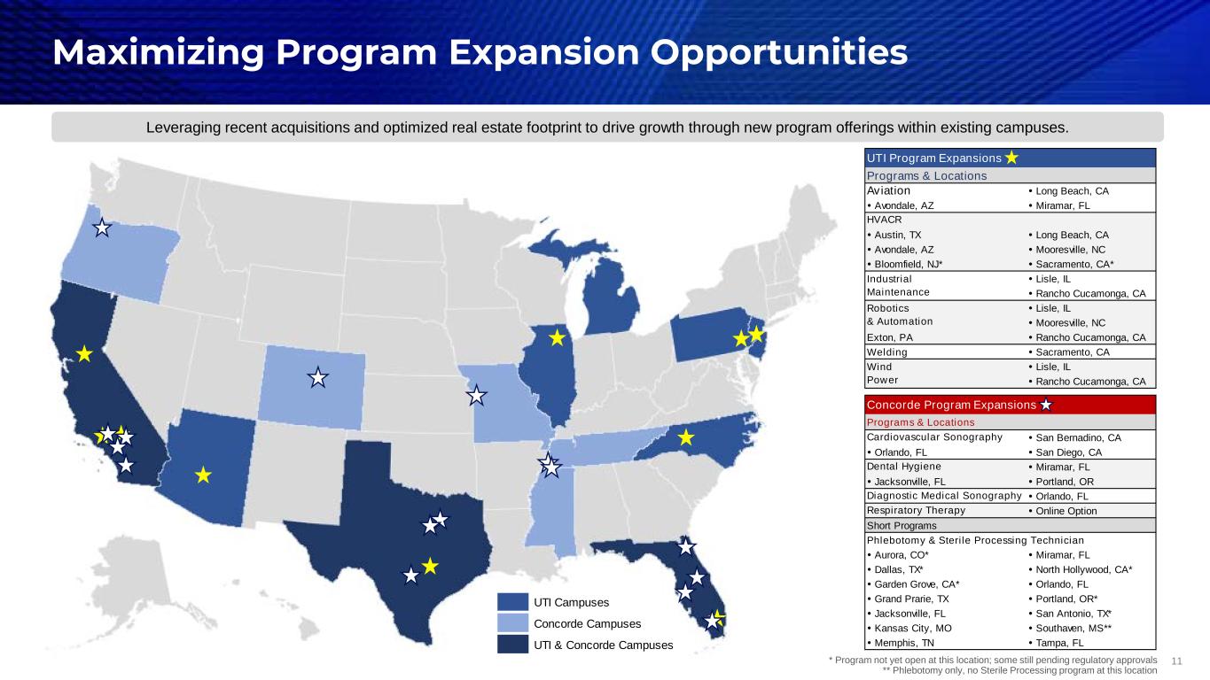 10 Healthcare Platform & Program Expansions Accelerating Growth and Diversification 10 Diversified Revenue Mix UTI UTI + Concorde Expanded Student Demographics UTI UTI + Concorde 14,380 26,000 $725M$419M Transportation Skilled Trades B2B Healthcare Male Female Healthcare support occupations are projected to grow the fastest of all occupational groups, at 15.4% from 2022 to 20322 Overall employment in healthcare occupations is expected to result in almost 2 million new jobs annually from 2022- 20321, driven by an aging workforce and an increasing demand for healthcare services 1 U.S. Bureau of Labor Statistics “Occupational Outlook Handbook” September 6, 2023 2 U.S. Bureau of Labor Statistics “Employment Projections: 2022-2032 Summary” September 6, 2023 3 “Tradespeople wanted: The need for critical trade skills in the US” McKinsey & Company April 9, 2024 Demand [for tradespeople] in US industry is projected to remain high due to infrastructure needs, a surge in real estate redevelopment, and the energy transition.3 FY2022 FY2024 Outlook FY2022 FY2024 Outlook Diversification Value Proposition Note: FY24 outlook aligns to midpoint of Company’s guidance