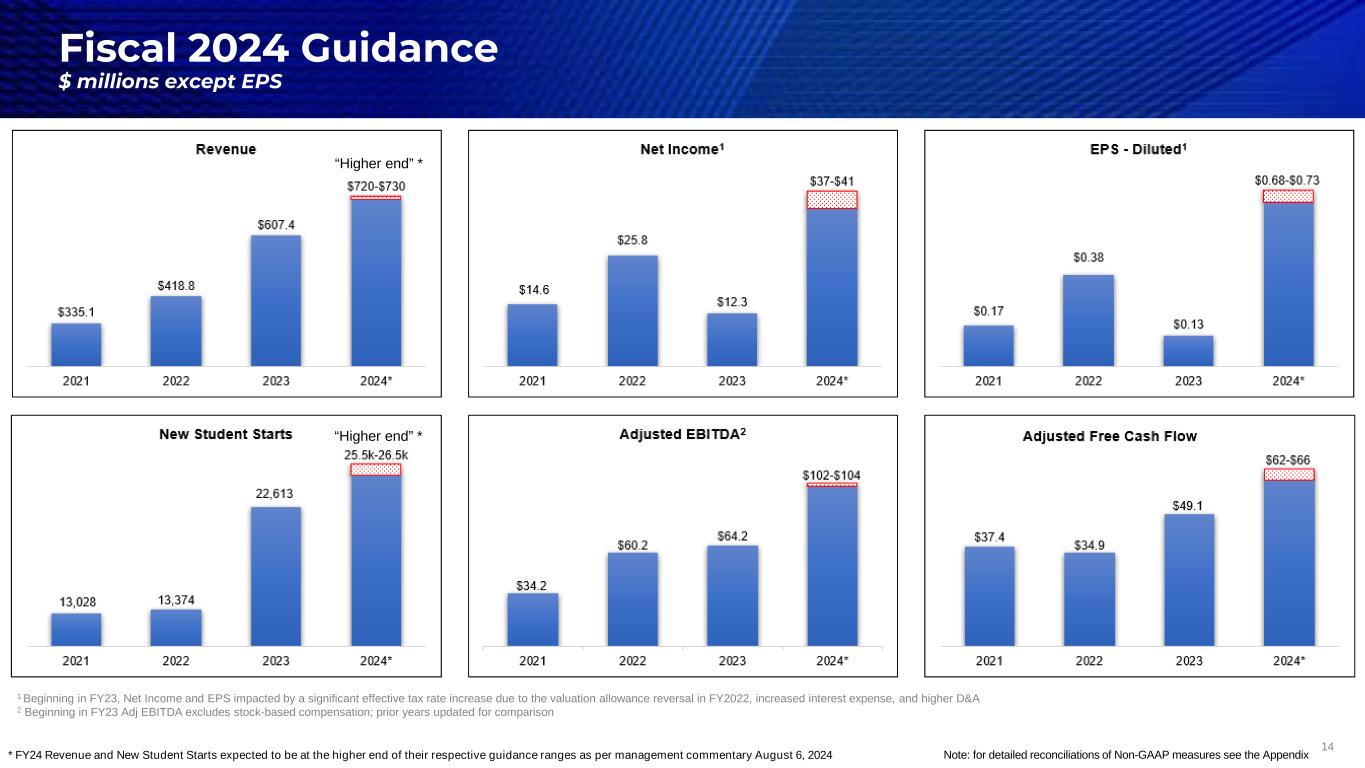 “Moving into the fourth quarter, we remain highly confident in our ability to achieve our guidance for the fiscal year. We are reiterating our full year guidance for all key metrics and currently expect to achieve the higher end of our guidance ranges for revenue and new student starts. We also remain confident in the initial expectations we provided for fiscal year 2025, which are revenue of nearly $800 million and adjusted EBITDA margin expansion of at least 100 basis points compared to fiscal year 2024. Our solid execution and experienced team, coupled with the growing markets we serve, position us well for continued success, and we look forward to further delivering upon the expectations we have set.”