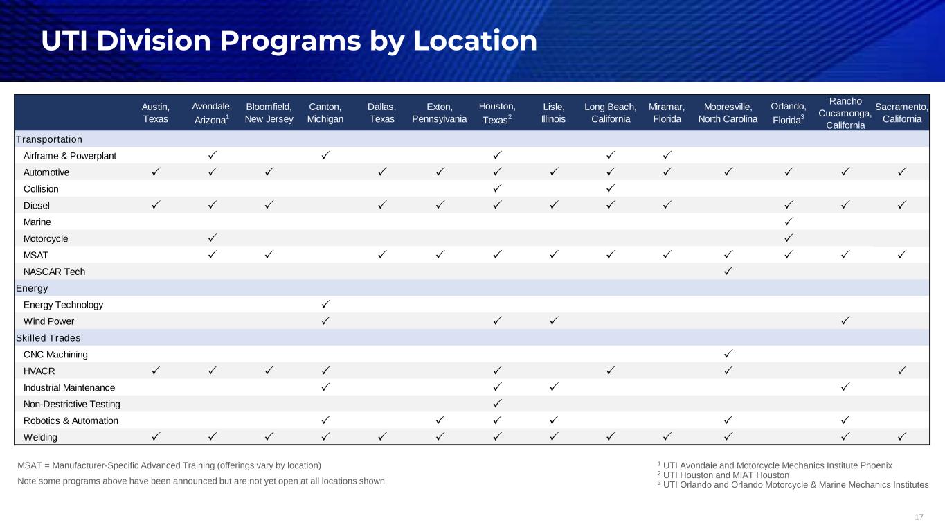 17 UTI Division Programs by Location MSAT = Manufacturer-Specific Advanced Training (offerings vary by location) Note some programs above have been announced but are not yet open at all locations shown 1 UTI Avondale and Motorcycle Mechanics Institute Phoenix 2 UTI Houston and MIAT Houston 3 UTI Orlando and Orlando Motorcycle & Marine Mechanics Institutes Austin, Texas Avondale, Arizona1 Bloomfield, New Jersey Canton, Michigan Dallas, Texas Exton, Pennsylvania Houston, Texas2 Lisle, Illinois Long Beach, California Miramar, Florida Mooresville, North Carolina Orlando, Florida3 Rancho Cucamonga, California Sacramento, California Transportation Airframe & Powerplant Automotive Collision Diesel Marine Motorcycle MSAT NASCAR Tech Energy Energy Technology Wind Power Skilled Trades CNC Machining HVACR Industrial Maintenance Non-Destrictive Testing Robotics & Automation Welding