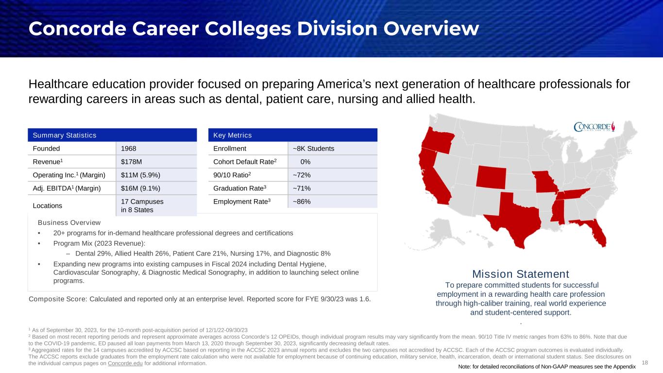 18 Business Overview • 20+ programs for in-demand healthcare professional degrees and certifications • Program Mix (2023 Revenue): – Dental 29%, Allied Health 26%, Patient Care 21%, Nursing 17%, and Diagnostic 8% • Expanding new programs into existing campuses in Fiscal 2024 including Dental Hygiene, Cardiovascular Sonography, & Diagnostic Medical Sonography, in addition to launching select online programs. Healthcare education provider focused on preparing America’s next generation of healthcare professionals for rewarding careers in areas such as dental, patient care, nursing and allied health. 1 As of September 30, 2023, for the 10-month post-acquisition period of 12/1/22-09/30/23 2 Based on most recent reporting periods and represent approximate averages across Concorde’s 12 OPEIDs, though individual program results may vary significantly from the mean. 90/10 Title IV metric ranges from 63% to 86%. Note that due to the COVID-19 pandemic, ED paused all loan payments from March 13, 2020 through September 30, 2023, significantly decreasing default rates. 3 Aggregated rates for the 14 campuses accredited by ACCSC based on reporting in the ACCSC 2023 annual reports and excludes the two campuses not accredited by ACCSC. Each of the ACCSC program outcomes is evaluated individually. The ACCSC reports exclude graduates from the employment rate calculation who were not available for employment because of continuing education, military service, health, incarceration, death or international student status. See disclosures on the individual campus pages on Concorde.edu for additional information. Mission Statement To prepare committed students for successful employment in a rewarding health care profession through high-caliber training, real world experience and student-centered support. . Summary Statistics Founded 1968 Revenue1 $178M Operating Inc.1 (Margin) $11M (5.9%) Adj. EBITDA1 (Margin) $16M (9.1%) Locations 17 Campuses in 8 States Key Metrics Enrollment ~8K Students Cohort Default Rate2 0% 90/10 Ratio2 ~72% Graduation Rate3 ~71% Employment Rate3 ~86% Concorde Career Colleges Division Overview Composite Score: Calculated and reported only at an enterprise level. Reported score for FYE 9/30/23 was 1.6. Note: for detailed reconciliations of Non-GAAP measures see the Appendix