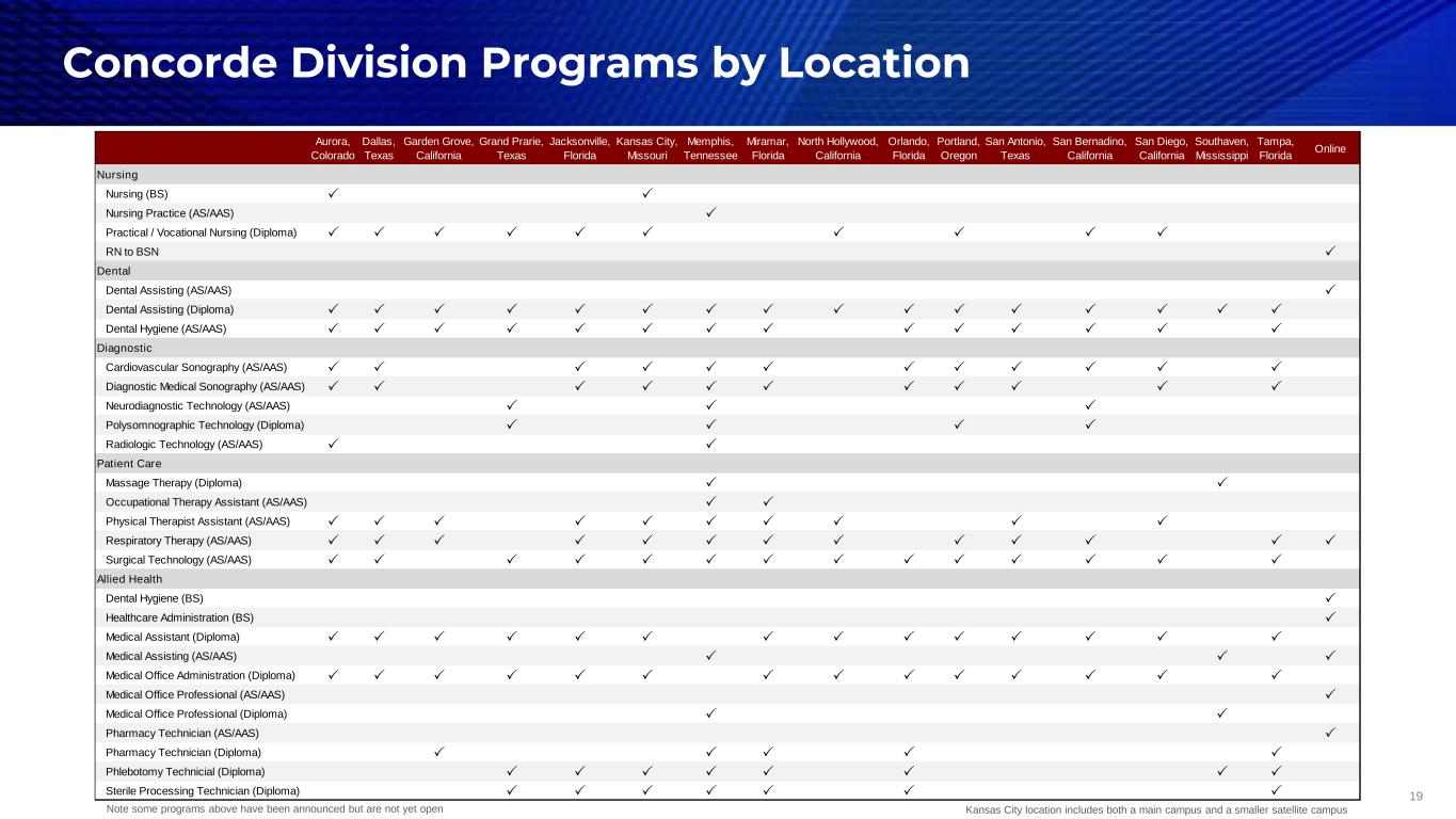 19 Concorde Division Programs by Location Note some programs above have been announced but are not yet open Kansas City location includes both a main campus and a smaller satellite campus Aurora, Colorado Dallas, Texas Garden Grove, California Grand Prarie, Texas Jacksonville, Florida Kansas City, Missouri Memphis, Tennessee Miramar, Florida North Hollywood, California Orlando, Florida Portland, Oregon San Antonio, Texas San Bernadino, California San Diego, California Southaven, Mississippi Tampa, Florida Online Nursing Nursing (BS) Nursing Practice (AS/AAS) Practical / Vocational Nursing (Diploma) RN to BSN Dental Dental Assisting (AS/AAS) Dental Assisting (Diploma) Dental Hygiene (AS/AAS) Diagnostic Cardiovascular Sonography (AS/AAS) Diagnostic Medical Sonography (AS/AAS) Neurodiagnostic Technology (AS/AAS) Polysomnographic Technology (Diploma) Radiologic Technology (AS/AAS) Patient Care Massage Therapy (Diploma) Occupational Therapy Assistant (AS/AAS) Physical Therapist Assistant (AS/AAS) Respiratory Therapy (AS/AAS) Surgical Technology (AS/AAS) Allied Health Dental Hygiene (BS) Healthcare Administration (BS) Medical Assistant (Diploma) Medical Assisting (AS/AAS) Medical Office Administration (Diploma) Medical Office Professional (AS/AAS) Medical Office Professional (Diploma) Pharmacy Technician (AS/AAS) Pharmacy Technician (Diploma) Phlebotomy Technicial (Diploma) Sterile Processing Technician (Diploma)