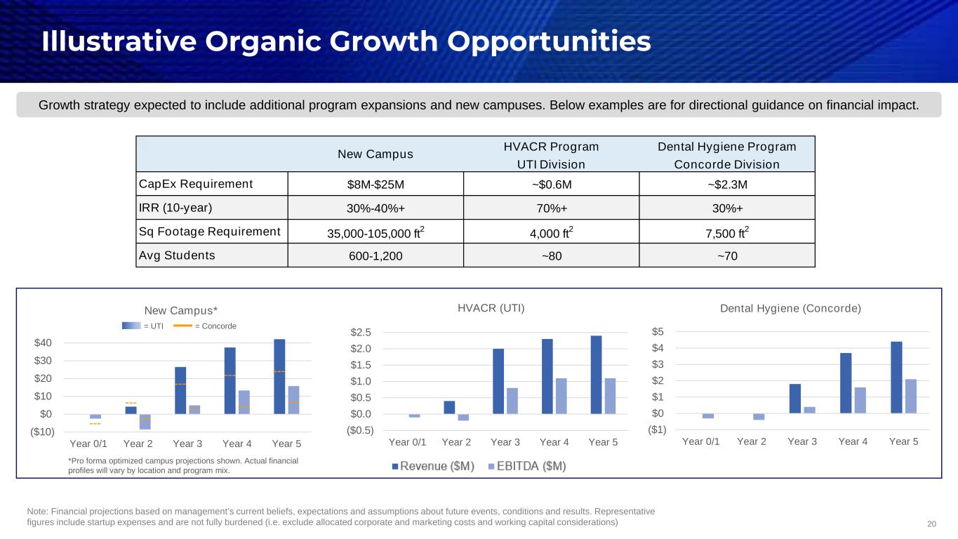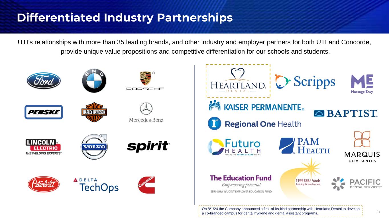 20 Illustrative Organic Growth Opportunities ($10) $0 $10 $20 $30 $40 Year 0/1 Year 2 Year 3 Year 4 Year 5 New Campus* ($0.5) $0.0 $0.5 $1.0 $1.5 $2.0 $2.5 Year 0/1 Year 2 Year 3 Year 4 Year 5 HVACR (UTI) ($1) $0 $1 $2 $3 $4 $5 Year 0/1 Year 2 Year 3 Year 4 Year 5 Dental Hygiene (Concorde) Note: Financial projections based on management’s current beliefs, expectations and assumptions about future events, conditions and results. Representative figures include startup expenses and are not fully burdened (i.e. exclude allocated corporate and marketing costs and working capital considerations) Growth strategy expected to include additional program expansions and new campuses. Below examples are for directional guidance on financial impact. HVACR Program Dental Hygiene Program UTI Division Concorde Division CapEx Requirement $8M-$25M ~$0.6M ~$2.3M IRR (10-year) 30%-40%+ 70%+ 30%+ Sq Footage Requirement 35,000-105,000 ft2 4,000 ft2 7,500 ft2 Avg Students 600-1,200 ~80 ~70 New Campus *Pro forma optimized campus projections shown. Actual financial profiles will vary by location and program mix. = UTI = Concorde