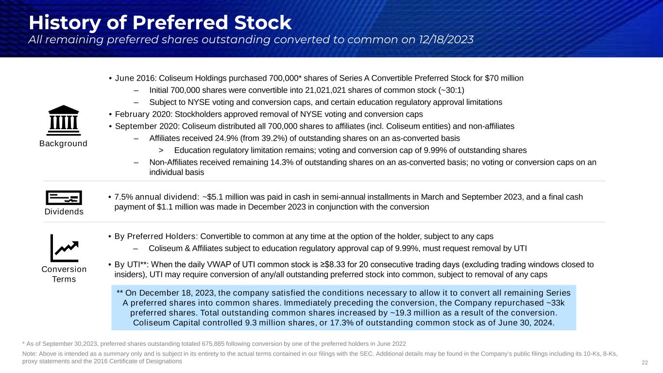 22 • June 2016: Coliseum Holdings purchased 700,000* shares of Series A Convertible Preferred Stock for $70 million – Initial 700,000 shares were convertible into 21,021,021 shares of common stock (~30:1) – Subject to NYSE voting and conversion caps, and certain education regulatory approval limitations • February 2020: Stockholders approved removal of NYSE voting and conversion caps • September 2020: Coliseum distributed all 700,000 shares to affiliates (incl. Coliseum entities) and non-affiliates – Affiliates received 24.9% (from 39.2%) of outstanding shares on an as-converted basis > Education regulatory limitation remains; voting and conversion cap of 9.99% of outstanding shares – Non-Affiliates received remaining 14.3% of outstanding shares on an as-converted basis; no voting or conversion caps on an individual basis Background Dividends • 7.5% annual dividend: ~$5.1 million was paid in cash in semi-annual installments in March and September 2023, and a final cash payment of $1.1 million was made in December 2023 in conjunction with the conversion • By Preferred Holders: Convertible to common at any time at the option of the holder, subject to any caps – Coliseum & Affiliates subject to education regulatory approval cap of 9.99%, must request removal by UTI • By UTI**: When the daily VWAP of UTI common stock is ≥$8.33 for 20 consecutive trading days (excluding trading windows closed to insiders), UTI may require conversion of any/all outstanding preferred stock into common, subject to removal of any capsConversion Terms History of Preferred Stock All remaining preferred shares outstanding converted to common on 12/18/2023 * As of September 30,2023, preferred shares outstanding totaled 675,885 following conversion by one of the preferred holders in June 2022 Note: Above is intended as a summary only and is subject in its entirety to the actual terms contained in our filings with the SEC. Additional details may be found in the Company’s public filings including its 10-Ks, 8-Ks, proxy statements and the 2016 Certificate of Designations ** On December 18, 2023, the company satisfied the conditions necessary to allow it to convert all remaining Series A preferred shares into common shares. Immediately preceding the conversion, the Company repurchased ~33k preferred shares. Total outstanding common shares increased by ~19.3 million as a result of the conversion. Coliseum Capital controlled 9.3 million shares, or 17.3% of outstanding common stock as of June 30, 2024.