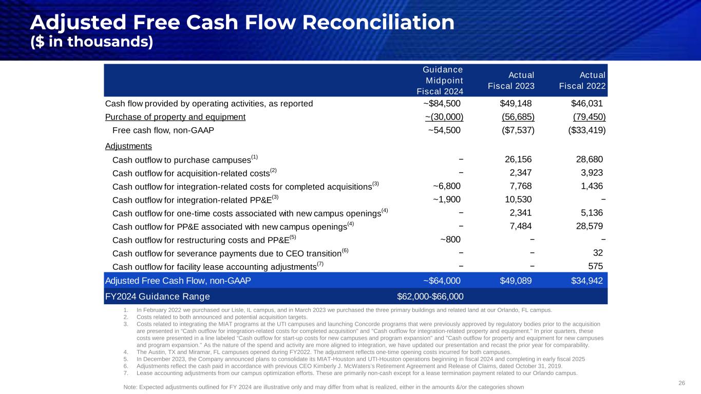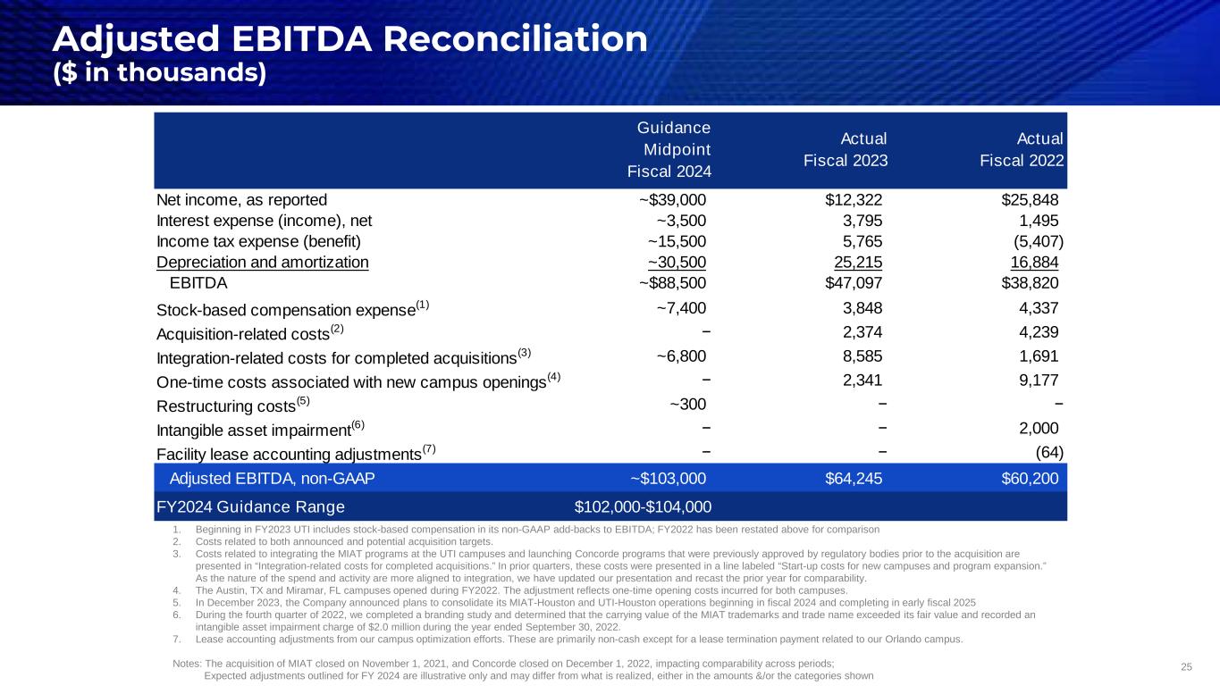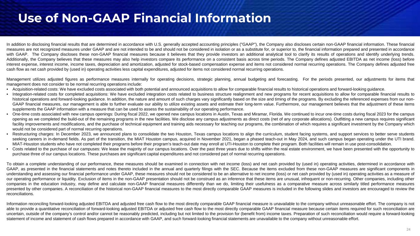 24 In addition to disclosing financial results that are determined in accordance with U.S. generally accepted accounting principles ("GAAP"), the Company also discloses certain non-GAAP financial information. These financial measures are not recognized measures under GAAP and are not intended to be and should not be considered in isolation or as a substitute for, or superior to, the financial information prepared and presented in accordance with GAAP. The Company discloses these non-GAAP financial measures because it believes that they provide investors an additional analytical tool to clarify its results of operations and identify underlying trends. Additionally, the Company believes that these measures may also help investors compare its performance on a consistent basis across time periods. The Company defines adjusted EBITDA as net income (loss) before interest expense, interest income, income taxes, depreciation and amortization, adjusted for stock-based compensation expense and items not considered normal recurring operations. The Company defines adjusted free cash flow as net cash provided by (used in) operating activities less capital expenditures, adjusted for items not considered normal recurring operations. Management utilizes adjusted figures as performance measures internally for operating decisions, strategic planning, annual budgeting and forecasting. For the periods presented, our adjustments for items that management does not consider to be normal recurring operations include: • Acquisition-related costs: We have excluded costs associated with both potential and announced acquisitions to allow for comparable financial results to historical operations and forward-looking guidance. • Integration-related costs for completed acquisitions: We have excluded integration costs related to business structure realignment and new programs for recent acquisitions to allow for comparable financial results to historical operations and forward-looking guidance. In addition, the nature and amount of such charges vary significantly based on the size and timing of the programs. By excluding the referenced expenses from our non- GAAP financial measures, our management is able to further evaluate our ability to utilize existing assets and estimate their long-term value. Furthermore, our management believes that the adjustment of these items supplements the GAAP information with a measure that can be used to assess the sustainability of our operating performance. • One-time costs associated with new campus openings: During fiscal 2022, we opened new campus locations in Austin, Texas and Miramar, Florida. We continued to incur one-time costs during fiscal 2023 for the campus opening as we completed the build-out of the remaining programs in the new facilities. We disclose any campus adjustments as direct costs (net of any corporate allocations). Outfitting a new campus requires significant facility improvements and modifications, and the purchase of technical equipment and training aids necessary for teaching our programs, the combination of which requires a significant investment by the Company which would not be considered part of normal recurring operations. • Restructuring charges: In December 2023, we announced plans to consolidate the two Houston, Texas campus locations to align the curriculum, student facing systems, and support services to better serve students seeking careers in in-demand fields. As part of the transition, the MIAT Houston campus, acquired in November 2021, began a phased teach-out in May 2024, and such campus began operating under the UTI brand. MIAT-Houston students who have not completed their programs before their program’s teach-out date may enroll at UTI-Houston to complete their program. Both facilities will remain in use post-consolidation. • Costs related to the purchase of our campuses: We lease the majority of our campus locations. Over the past three years due to shifts within the real estate environment, we have been presented with the opportunity to purchase three of our campus locations. These purchases are significant capital expenditures and not considered part of normal recurring operations. To obtain a complete understanding of our performance, these measures should be examined in connection with net income (loss) and net cash provided by (used in) operating activities, determined in accordance with GAAP, as presented in the financial statements and notes thereto included in the annual and quarterly filings with the SEC. Because the items excluded from these non-GAAP measures are significant components in understanding and assessing our financial performance under GAAP, these measures should not be considered to be an alternative to net income (loss) or net cash provided by (used in) operating activities as a measure of our operating performance or liquidity. Exclusion of items in the non-GAAP presentation should not be construed as an inference that these items are unusual, infrequent or non-recurring. Other companies, including other companies in the education industry, may define and calculate non-GAAP financial measures differently than we do, limiting their usefulness as a comparative measure across similarly titled performance measures presented by other companies. A reconciliation of the historical non-GAAP financial measures to the most directly comparable GAAP measures is included in the following slides and investors are encouraged to review the reconciliations. Information reconciling forward-looking adjusted EBITDA and adjusted free cash flow to the most directly comparable GAAP financial measure is unavailable to the company without unreasonable effort. The company is not able to provide a quantitative reconciliation of forward-looking adjusted EBITDA or adjusted free cash flow to the most directly comparable GAAP financial measure because certain items required for such reconciliation are uncertain, outside of the company