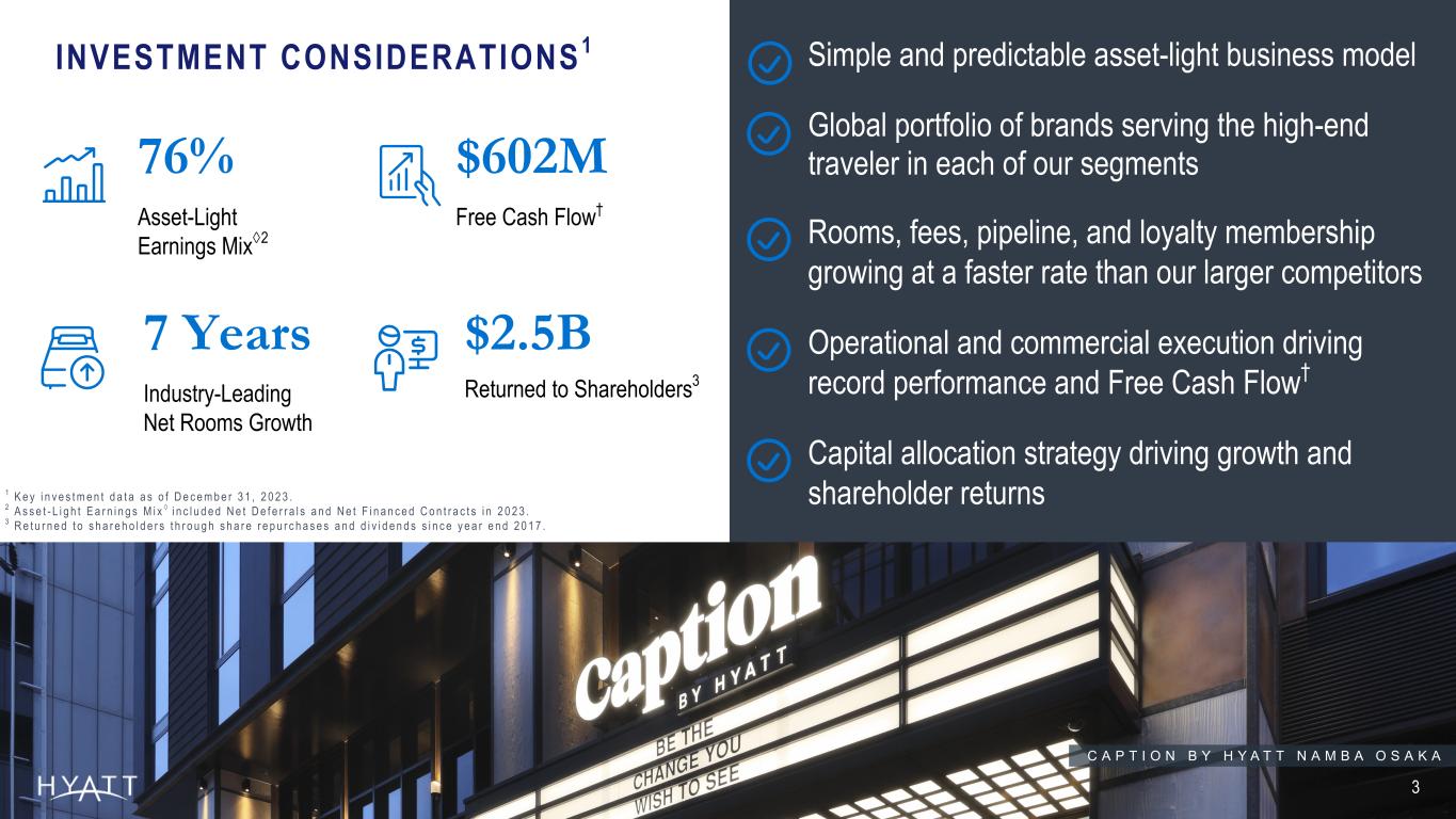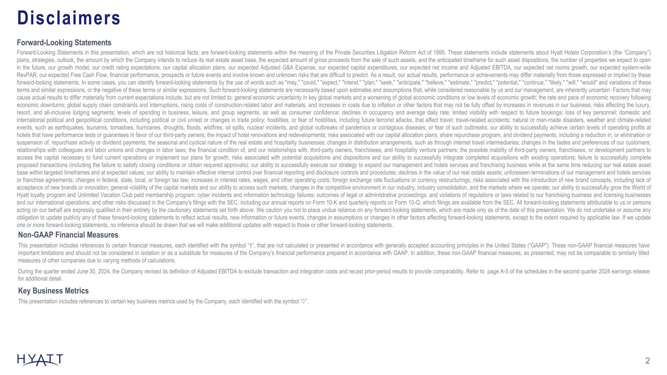 Disclaimers 2 Forward-Looking Statements in this presentation, which are not historical facts, are forward-looking statements within the meaning of the Private Securities Litigation Reform Act of 1995. These statements include statements about Hyatt Hotels Corporation’s (the “Company”) plans, strategies, outlook, the amount by which the Company intends to reduce its real estate asset base, the expected amount of gross proceeds from the sale of such assets, and the anticipated timeframe for such asset dispositions, the number of properties we expect to open in the future, our growth model, our credit rating expectations, our capital allocation plans, our expected Adjusted G&A Expense, our expected capital expenditures, our expected net income and Adjusted EBITDA, our expected net rooms growth, our expected system-wide RevPAR, our expected Free Cash Flow, financial performance, prospects or future events and involve known and unknown risks that are difficult to predict. As a result, our actual results, performance or achievements may differ materially from those expressed or implied by these forward-looking statements. In some cases, you can identify forward-looking statements by the use of words such as "may," "could," "expect," "intend," "plan," "seek," "anticipate," "believe," "estimate," "predict," "potential," "continue," "likely," "will," "would" and variations of these terms and similar expressions, or the negative of these terms or similar expressions. Such forward-looking statements are necessarily based upon estimates and assumptions that, while considered reasonable by us and our management, are inherently uncertain. Factors that may cause actual results to differ materially from current expectations include, but are not limited to: general economic uncertainty in key global markets and a worsening of global economic conditions or low levels of economic growth; the rate and pace of economic recovery following economic downturns; global supply chain constraints and interruptions, rising costs of construction-related labor and materials, and increases in costs due to inflation or other factors that may not be fully offset by increases in revenues in our business; risks affecting the luxury, resort, and all-inclusive lodging segments; levels of spending in business, leisure, and group segments, as well as consumer confidence; declines in occupancy and average daily rate; limited visibility with respect to future bookings; loss of key personnel; domestic and international political and geopolitical conditions, including political or civil unrest or changes in trade policy; hostilities, or fear of hostilities, including future terrorist attacks, that affect travel; travel-related accidents; natural or man-made disasters, weather and climate-related events, such as earthquakes, tsunamis, tornadoes, hurricanes, droughts, floods, wildfires, oil spills, nuclear incidents, and global outbreaks of pandemics or contagious diseases, or fear of such outbreaks; our ability to successfully achieve certain levels of operating profits at hotels that have performance tests or guarantees in favor of our third-party owners; the impact of hotel renovations and redevelopments; risks associated with our capital allocation plans, share repurchase program, and dividend payments, including a reduction in, or elimination or suspension of, repurchase activity or dividend payments; the seasonal and cyclical nature of the real estate and hospitality businesses; changes in distribution arrangements, such as through internet travel intermediaries; changes in the tastes and preferences of our customers; relationships with colleagues and labor unions and changes in labor laws; the financial condition of, and our relationships with, third-party owners, franchisees, and hospitality venture partners; the possible inability of third-party owners, franchisees, or development partners to access the capital necessary to fund current operations or implement our plans for growth; risks associated with potential acquisitions and dispositions and our ability to successfully integrate completed acquisitions with existing operations; failure to successfully complete proposed transactions (including the failure to satisfy closing conditions or obtain required approvals); our ability to successfully execute our strategy to expand our management and hotels services and franchising business while at the same time reducing our real estate asset base within targeted timeframes and at expected values; our ability to maintain effective internal control over financial reporting and disclosure controls and procedures; declines in the value of our real estate assets; unforeseen terminations of our management and hotels services or franchise agreements; changes in federal, state, local, or foreign tax law; increases in interest rates, wages, and other operating costs; foreign exchange rate fluctuations or currency restructurings; risks associated with the introduction of new brand concepts, including lack of acceptance of new brands or innovation; general volatility of the capital markets and our ability to access such markets; changes in the competitive environment in our industry, industry consolidation, and the markets where we operate; our ability to successfully grow the World of Hyatt loyalty program and Unlimited Vacation Club paid membership program; cyber incidents and information technology failures; outcomes of legal or administrative proceedings; and violations of regulations or laws related to our franchising business and licensing businesses and our international operations; and other risks discussed in the Company's filings with the SEC, including our annual reports on Form 10-K and quarterly reports on Form 10-Q, which filings are available from the SEC. All forward-looking statements attributable to us or persons acting on our behalf are expressly qualified in their entirety by the cautionary statements set forth a