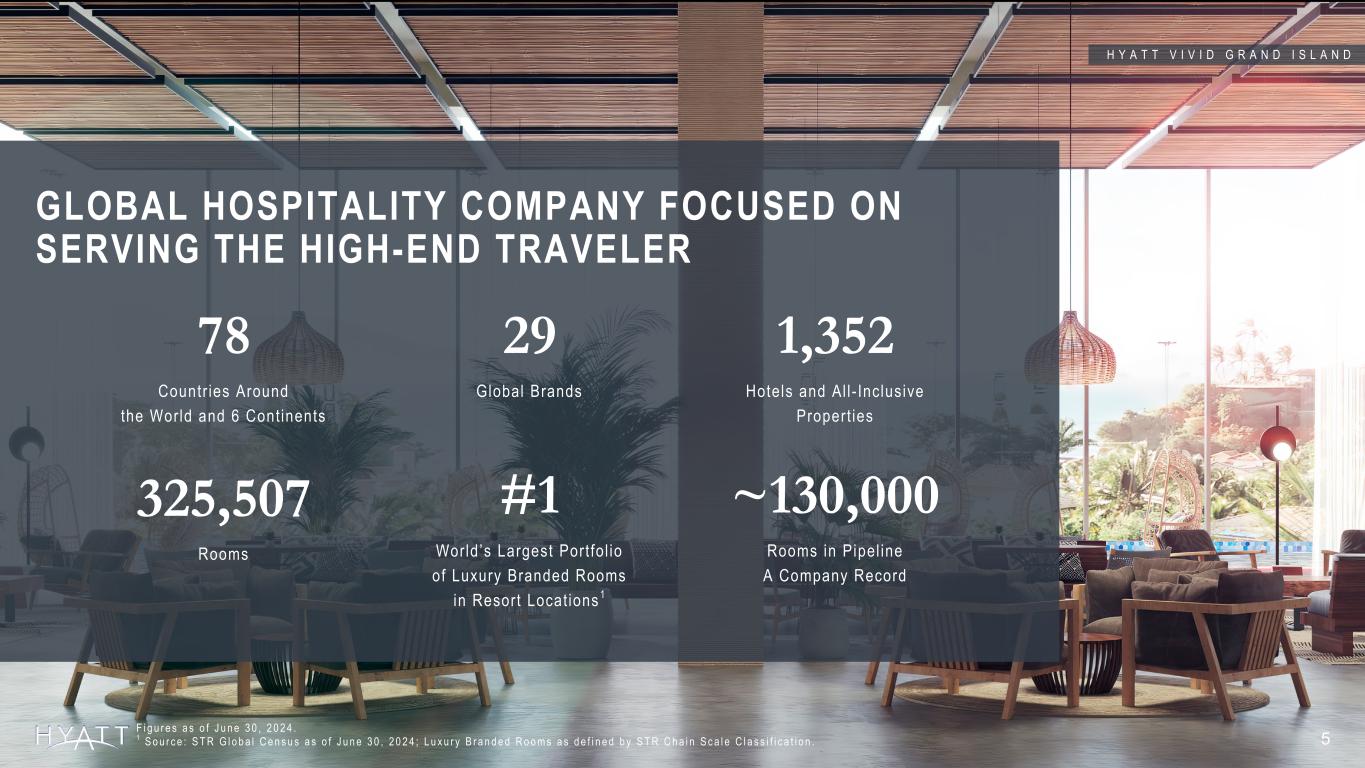 STRATEGIC GROWTH ACROSS MULTIPLE DIMENSIONS 4 +73% +95% +81% +340% +2,900 bps 20232017 20232017 20232017 20232017 20232017 SYSTEM-WIDE ROOMS GROSS FEE REVENUE PIPELINE LOYALTY MEMBERS ASSET-LIGHT EARNINGS MIX ◊1 186K 322K $970M $498M 127K 70K 44M 10M 76% 47% 1 A s s e t - L i g h t E a r n i n g s M i x ◊ i n c l u d e d N e t D e f e r r a l s a n d N e t F i n a n c e d C o n t r a c t s i n 2 0 2 3 . C a l c u l a t e d c o m p a r i s o n s b a s e d o n y e a r e n d s 2 0 1 7 a n d 2 0 2 3 . 2 0 1 7 g r o s s f e e r e v e n u e r e p r e s e n t s m a n a g e m e n t , f r a n c h i s e , a n d o t h e r f e e s f o l l o w i n g t h e a d o p t i o n o f A S C 6 0 6 d u r i n g t h e y e a r e n d e d D e c e m b e r 3 1 , 2 0 1 8 a s d i s c l o s e d i n o u r 2 0 1 8 F o r m 1 0 - K . 2 0 2 3 g r o s s f e e r e v e n u e s r e p r e s e n t s t h e r e c a s t f i g u r e s p r o v i d e d i n t h e s u p p l e m e n t a l f i n a n c i a l i n f o r m a t i o n o n F o r m 8 - K f i l e d o n A p r i l 2 5 , 2 0 2 4 . Source Notes: Updated Annually Support: Hyatt Hotels\CHICO-Team-Corporate FPA - Documents\Fact Pack and QA Document\2024\Investor Consideration Deck Support\Annual \ Strategic Growth support file -2009 Data can be found under 2009 folder System-wide rooms based on Inventory as of December 31, 2009 Fee Revenue, pipeline, and loyalty members based on Hyatt 2009 Annual Report -2017 Data can be found under 2017 folder System-wide rooms based on Inventory as of December 31, 2017 Fee Revenue and pipeline based on Q4 2017 Earnings Release Loyalty members based on 10-K 2017 -2023 Data System-wide rooms based on Inventory as of December 31, 2023 Fee Revenue and pipeline based on Q4 2023 Earnings Release Loyalty members based on 10-K 2023 as well as Enrollment and Program member count Q4 2023