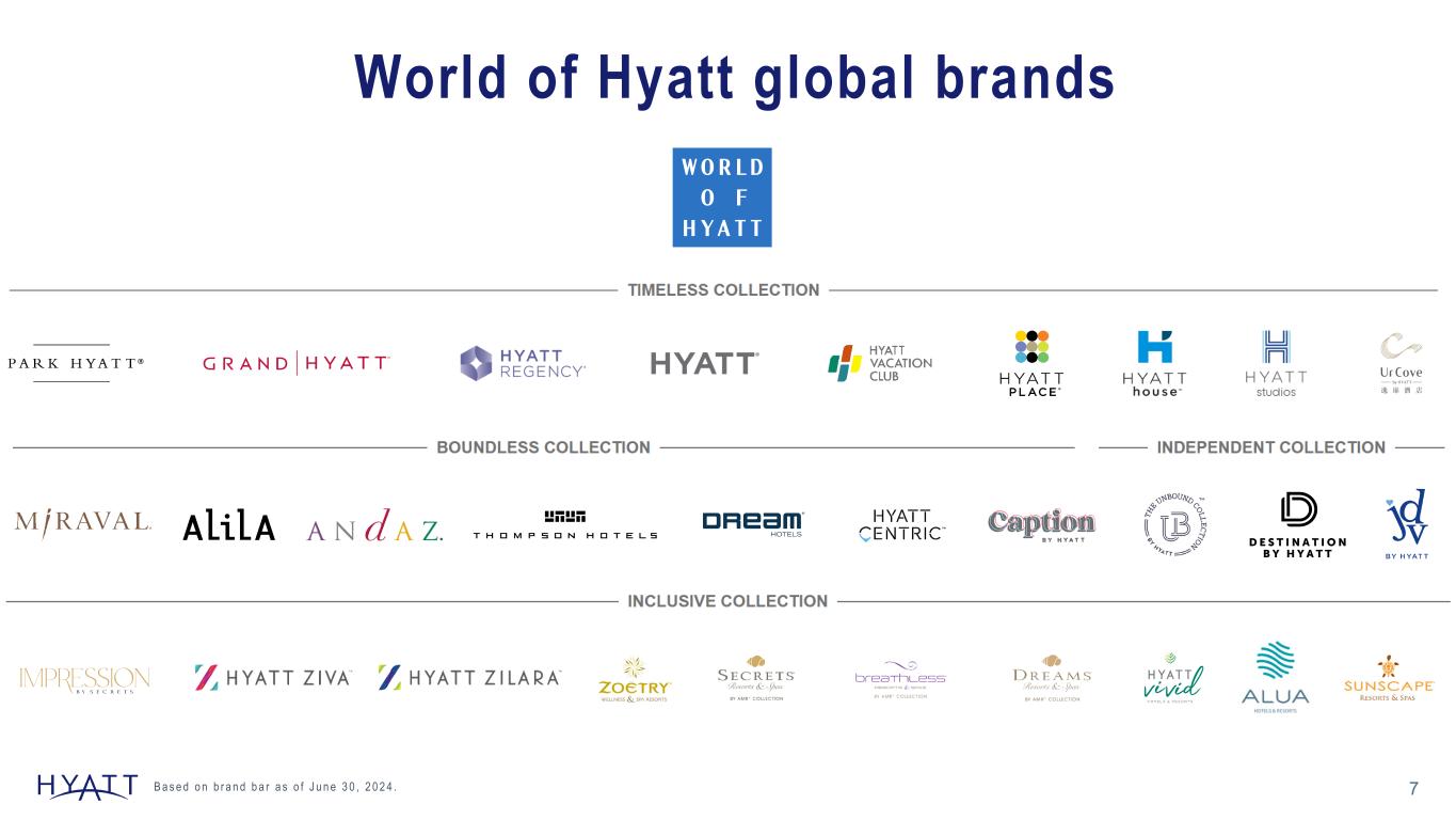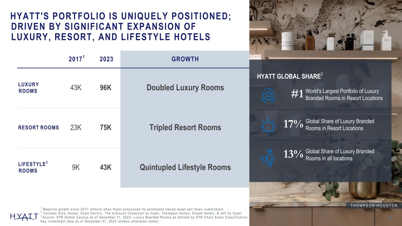 20171 2023 GROWTH LUXURY ROOMS 43K 96K Doubled Luxury Rooms RESORT ROOMS 23K 75K Tripled Resort Rooms LIFESTYLE2 ROOMS 9K 43K Quintupled Lifestyle Rooms HYATT'S PORTFOLIO IS UNIQUELY POSITIONED; DRIVEN BY SIGNIFICANT EXPANSION OF LUXURY, RESORT, AND LIFESTYLE HOTELS 6 HYATT GLOBAL SHARE3 #1 World's Largest Portfolio of Luxury Branded Rooms in Resort Locations 17% Global Share of Luxury Branded Rooms in Resort Locations 13% Global Share of Luxury Branded Rooms in all locations T H O M P S O N H O U S T O N 1 B a s e l i n e g r o w t h s i n c e 2 0 1 7 r e f l e c t s w h e n H y a t t a n n o u n c e d i t s p e r m a n e n t o w n e d a s s e t s e l l d o w n c o m m i t m e n t . 2 I n c l u d e s A l i l a , A n d a z , H y a t t C e n t r i c , T h e U n b o u n d C o l l e c t i o n b y H y a t t , T h o m p s o n H o t e l s , D r e a m H o t e l s , & J d V b y H y a t t . 3 S o u r c e : S T R G l o b a l C e n s u s a s o f D e c e m b e r 3 1 , 2 0 2 3 ; L u x u r y B r a n d e d R o o m s a s d e f i n e d b y S T R C h a i n S c a l e C l a s s i f i c a t i o n . K e y i n v e s t m e n t d a t a a s o f D e c e m b e r 3 1 , 2 0 2 3 ( u n l e s s o t h e r w i s e n o t e d ) . Source Notes: Updated Annually Support: Hyatt Hotels\CHICO-Team-Corporate FPA - Documents\Fact Pack and QA Document\202X\Investor Consideration Deck Support\Annual -Luxury, Lifestyle, and Resort rooms calculated based on HHC Inventory as of Year end and calculated based on Luxury Lifestyle or Resort Support file -Hyatt Global Share calculated based on STR census as of Year-end.