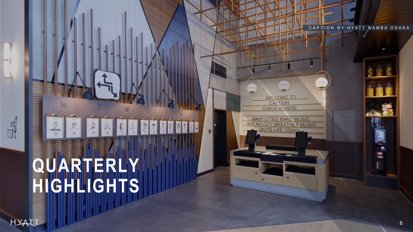 In the second quarter, 18 new hotels (or 3,251 rooms) joined Hyatt's portfolio. Notable openings included Park Hyatt Changsha, Maison Métier, The Legend Paracas Resort, the first Destination by Hyatt property in Peru, and Hyatt Vivid Grand Island, the first open Hyatt Vivid Hotels & Resorts property. Additionally, the first Caption by Hyatt properties outside the United States opened in the quarter: Caption by Hyatt Namba Osaka and Caption by Hyatt Zhongshan Park Shanghai. The first Hyatt Centric in Shanghai, China, Hyatt Centric Zhongshan Park Shanghai, also opened in the quarter.