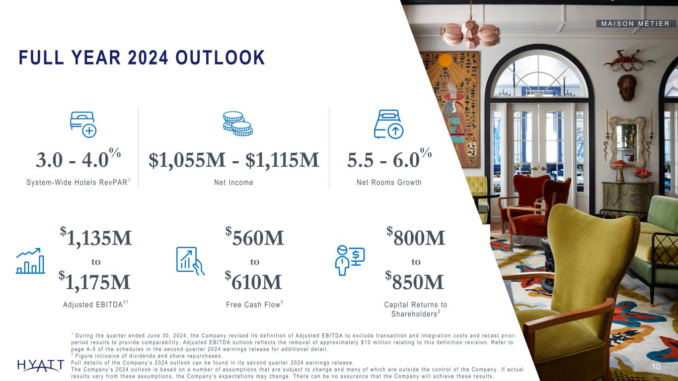 ADJUSTED EBITDA† DILUTED EPS GROSS FEES A N E W R E C O R D $359M NET INCOME $3.46 $307M $275M OPERATIONAL RESULTSFINANCIAL RESULTS +9% INCREASE OF ROOMS IN P IPEL INE 1 3 0 , 0 0 0 | A N E W R E C O R D +4.6% NET ROOMS GROWTH +4.7% SYSTEM-WIDE HOTELS REVPAR ◊ +21% WORLD OF HYATT MEMBER GROWTH 4 8 M | A N E W R E C O R D Source Notes: Operational Results: RevPAR and NRG are linked to ER. Pipeline increase should be calculated vs prior year’s ER (rounded pipeline) vs current year rounded pipeline #. World of Hyatt Member growth: Teams\Hyatt Hotels\CHICO-Team- Corporate FPA - Documents\Hotel FP&A\World of Hyatt Enrollments 9 Q2 2024 HIGHLIGHTS • World of Hyatt named “Best Hotel Rewards Program” and the World of Hyatt Credit Card named “Best Overall Hotel Credit Card” by WalletHub • 80% of Mr & Mrs Smith properties listed on Hyatt channels have received bookings from World of Hyatt members with nearly two-thirds of bookings for paid reservations; Globalists accounted for >20% of these bookings • Announced an exclusive alliance with Under Canvas1, the leader in upscale outdoor hospitality, where World of Hyatt members can now earn and redeem points at Under Canvas locations F i g u r e s a s o f J u n e 3 0 , 2 0 2 4 , a n d g r o w t h r a t e s r e p r e s e n t y e a r - o v e r - y e a r c o m p a r i s o n s f r o m Q 2 2 0 2 3 v s . Q 2 2 0 2 4 . 1 U n d e r C a n v a s a l l i a n c e a n n o u n c e d a n d l a u n c h e d J u l y 2 5 , 2 0 2 4 . P A R K H Y A T T C H A N G S H A N E W L Y O P E N E D Q 2 2 0 2 4 HIGHLIGHTS