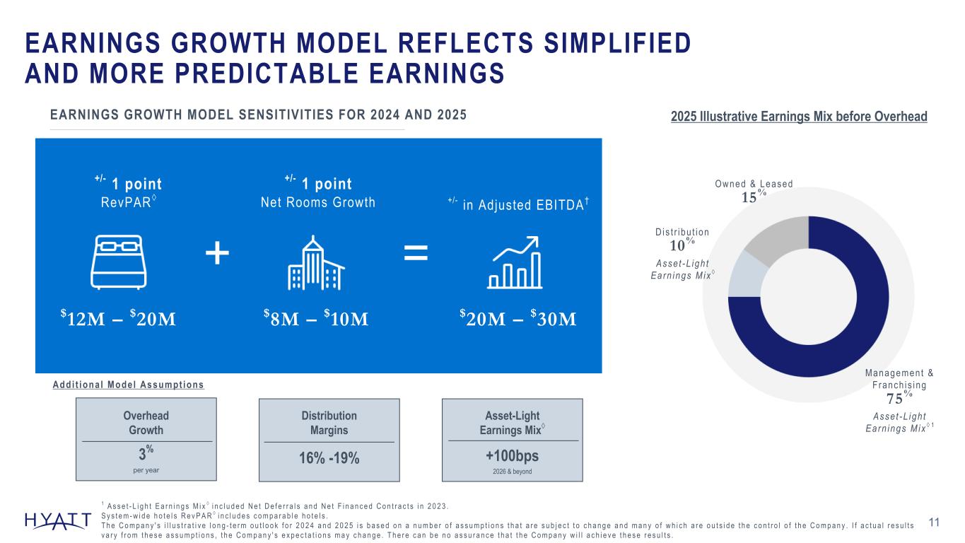 FULL YEAR 2024 OUTLOOK 10 M A I S O N M É T I E R $1,135M to $1,175M Adjusted EBITDA †1 $560M to $610M Free Cash Flow † $800M to $850M Capi ta l Returns to Shareholders 2 1 D u r i n g t h e q u a r t e r e n d e d J u n e 3 0 , 2 0 2 4 , t h e C o m p a n y r e v i s e d i t s d e f i n i t i o n o f A d j u s t e d E B I T D A t o e x c l u d e t r a n s a c t i o n a n d i n t e g r a t i o n c o s t s a n d r e c a s t p r i o r - p e r i o d r e s u l t s t o p r o v i d e c o m p a r a b i l i t y . A d j u s t e d E B I T D A o u t l o o k r e f l e c t s t h e r e m o v a l o f a p p r o x i m a t e l y $ 1 0 m i l l i o n r e l a t i n g t o t h i s d e f i n i t i o n r e v i s i o n . R e f e r t o p a g e A - 5 o f t h e s c h e d u l e s i n t h e s e c o n d q u a r t e r 2 0 2 4 e a r n i n g s r e l e a s e f o r a d d i t i o n a l d e t a i l . 2 F i g u r e i n c l u s i v e o f d i v i d e n d s a n d s h a r e r e p u r c h a s e s . F u l l d e t a i l s o f t h e C o m p a n y ’ s 2 0 2 4 o u t l o o k c a n b e f o u n d i n i t s s e c o n d q u a r t e r 2 0 2 4 e a r n i n g s r e l e a s e . T h e C o m p a n y ’ s 2 0 2 4 o u t l o o k i s b a s e d o n a n u m b e r o f a s s u m p t i o n s t h a t a r e s u b j e c t t o c h a n g e a n d m a n y o f w h i c h a r e o u t s i d e t h e c o n t r o l o f t h e C o m p a n y . I f a c t u a l r e s u l t s v a r y f r o m t h e s e a s s u m p t i o n s , t h e C o m p a n y ' s e x p e c t a t i o n s m a y c h a n g e . T h e r e c a n b e n o a s s u r a n c e t h a t t h e C o m p a n y w i l l a c h i e v e t h e s e r e s u l t s . Source Notes: 3.0 - 4.0% System-Wide Hote ls RevPAR ◊ $1,055M - $1,115M Net Income 5.5 - 6.0% Net Rooms Growth