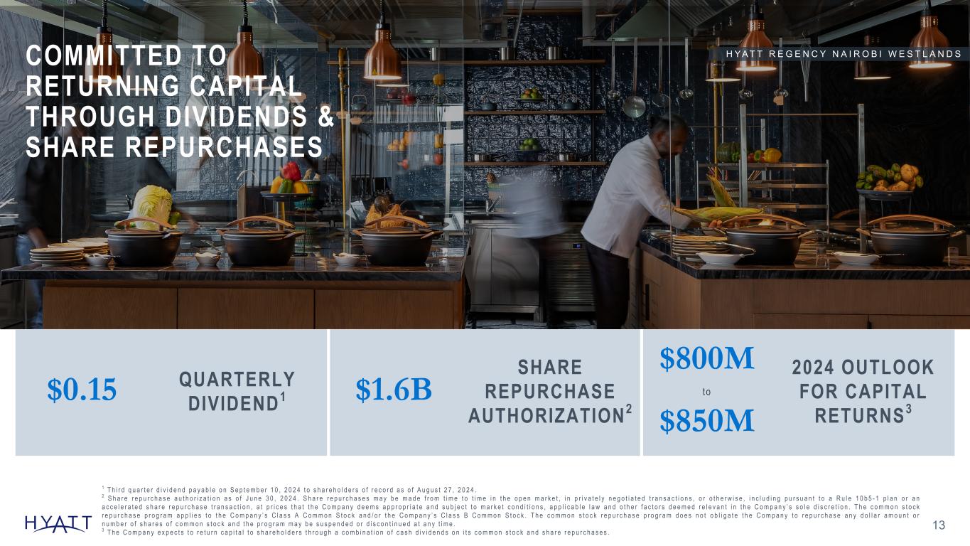 CAPITAL ALLOCATION STRATEGY 12 WE HAVE AND WILL CONTINUE TO: Invest in growth to increase shareholder value Return excess cash to shareholders Commit to an investment-grade profile P A R K H Y A T T C H A N G S H A