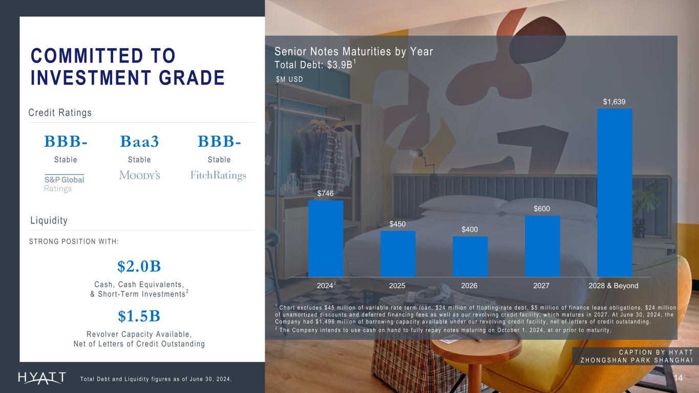 $0.15 QUARTERLY DIVIDEND1 $1.6B SHARE REPURCHASE AUTHORIZATION2 $800M t o $850M 2024 OUTLOOK FOR CAPITAL RETURNS3 COMMITTED TO RETURNING CAPITAL THROUGH DIVIDENDS & SHARE REPURCHASES 13 H Y A T T R E G E N C Y N A I R O B I W E S T L A N D S 1 T h i r d q u a r t e r d i v i d e n d p a y a b l e o n S e p t e m b e r 1 0 , 2 0 2 4 t o s h a r e h o l d e r s o f r e c o r d a s o f A u g u s t 2 7 , 2 0 2 4 . 2 S h a r e r e p u r c h a s e a u t h o r i z a t i o n a s o f J u n e 3 0 , 2 0 2 4 . S h a r e r e p u r c h a s e s m a y b e m a d e f r o m t i m e t o t i m e i n t h e o p e n m a r k e t , i n p r i v a t e l y n e g o t i a t e d t r a n s a c t i o n s , o r o t h e r w i s e , i n c l u d i n g p u r s u a n t t o a R u l e 1 0 b 5 - 1 p l a n o r a n a c c e l e r a t e d s h a r e r e p u r c h a s e t r a n s a c t i o n , a t p r i c e s t h a t t h e C o m p a n y d e e m s a p p r o p r i a t e a n d s u b j e c t t o m a r k e t c o n d i t i o n s , a p p l i c a b l e l a w a n d o t h e r f a c t o r s d e e m e d r e l e v a n t i n t h e C o m p a n y ’ s s o l e d i s c r e t i o n . T h e c o m m o n s t o c k r e p u r c h a s e p r o g r a m a p p l i e s t o t h e C o m p a n y ’ s C l a s s A C o m m o n S t o c k a n d / o r t h e C o m p a n y ’ s C l a s s B C o m m o n S t o c k . T h e c o m m o n s t o c k r e p u r c h a s e p r o g r a m d o e s n o t o b l i g a t e t h e C o m p a n y t o r e p u r c h a s e a n y d o l l a r a m o u n t o r n u m b e r o f s h a r e s o f c o m m o n s t o c k a n d t h e p r o g r a m m a y b e s u s p e n d e d o r d i s c o n t i n u e d a t a n y t i m e . 3 T h e C o m p a n y e x p e c t s t o r e t u r n c a p i t a l t o s h a r e h o l d e r s t h r o u g h a c o m b i n a t i o n o f c a s h d i v i d e n d s o n i t s c o m m o n s t o c k a n d s h a r e r e p u r c h a s e s . Source Notes: