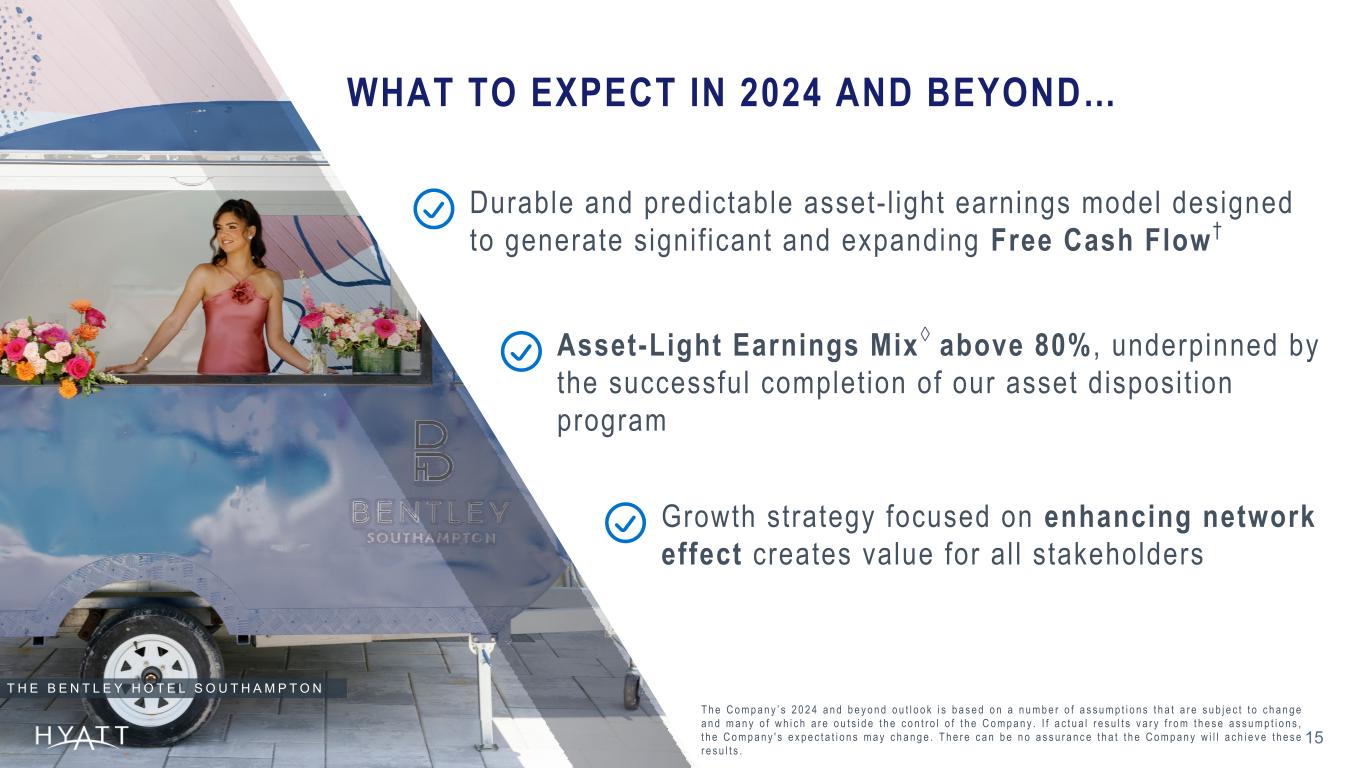 INVESTMENT CONSIDERATIONS 1 3 76% Asset-Light Earnings Mix◊2 7 Years Industry-Leading Net Rooms Growth Simple and predictable asset-light business model Global portfolio of brands serving the high-end traveler in each of our segments Rooms, fees, pipeline, and loyalty membership growing at a faster rate than our larger competitors Operational and commercial execution driving record performance and Free Cash Flow† Capital allocation strategy driving growth and shareholder returns $2.5B Returned to Shareholders3 C A P T I O N B Y H Y A T T N A M B A O S A K A $602M Free Cash Flow† 1 K e y i n v e s t m e n t d a t a a s o f D e c e m b e r 3 1 , 2 0 2 3 . 2 A s s e t - L i g h t E a r n i n g s M i x ◊ i n c l u d e d N e t D e f e r r a l s a n d N e t F i n a n c e d C o n t r a c t s i n 2 0 2 3 . 3 R e t u r n e d t o s h a r e h o l d e r s t h r o u g h s h a r e r e p u r c h a s e s a n d d i v i d e n d s s i n c e y e a r e n d 2 0 1 7 . Source Notes: