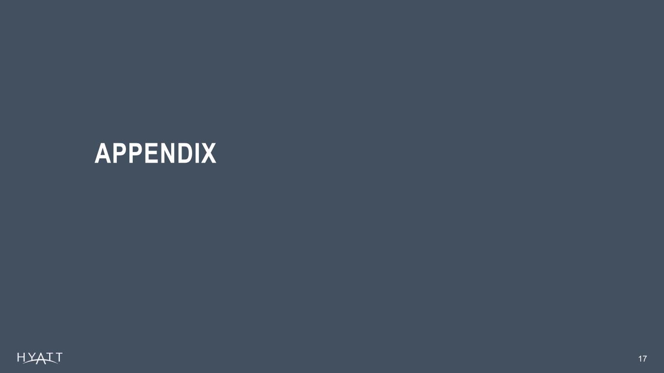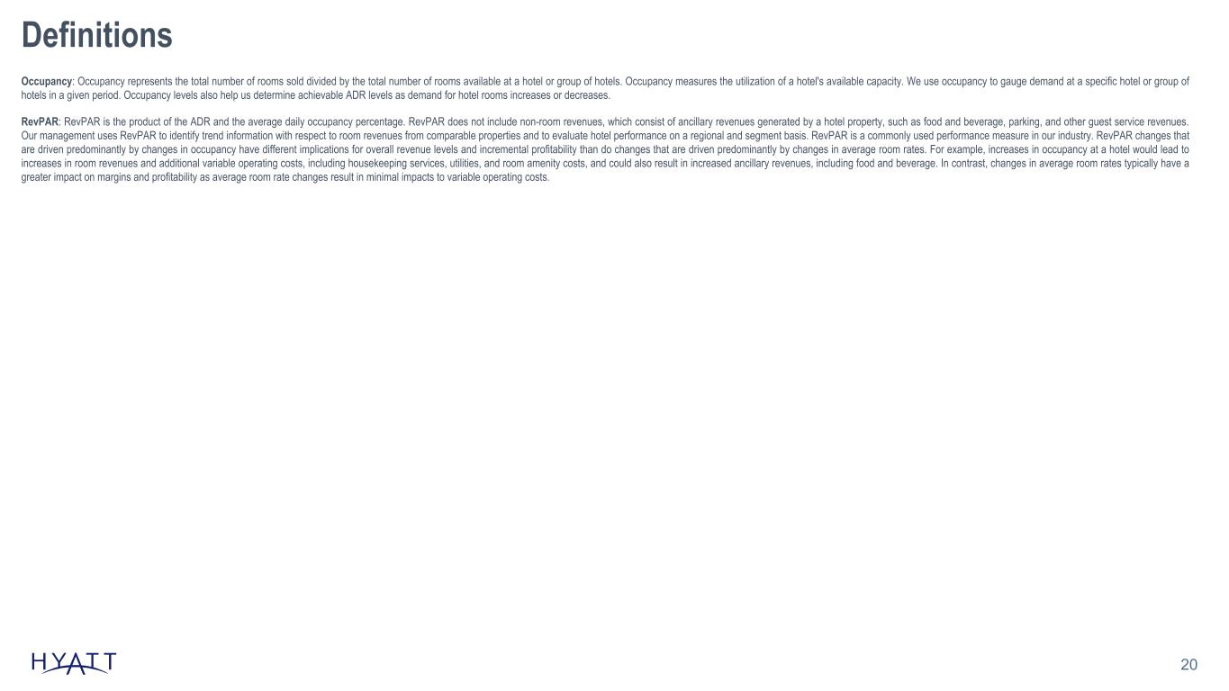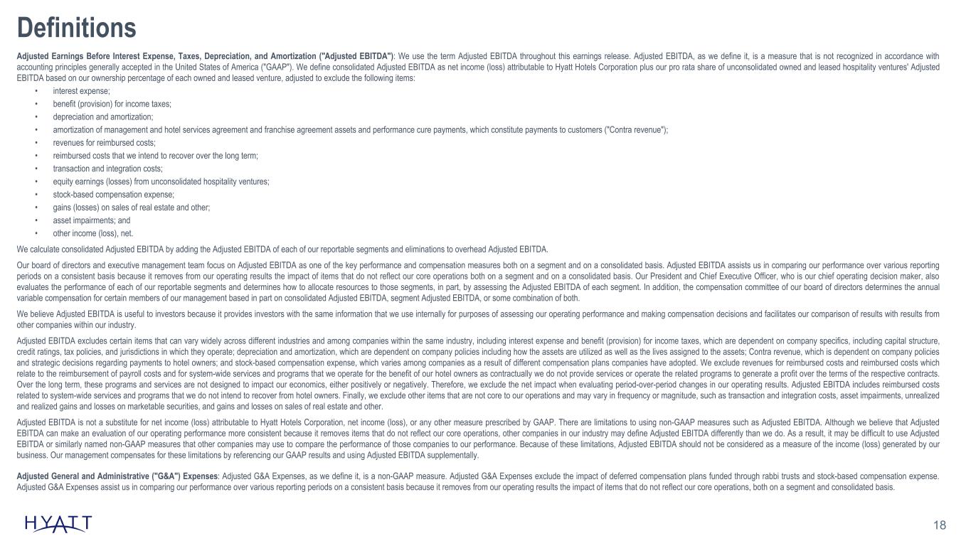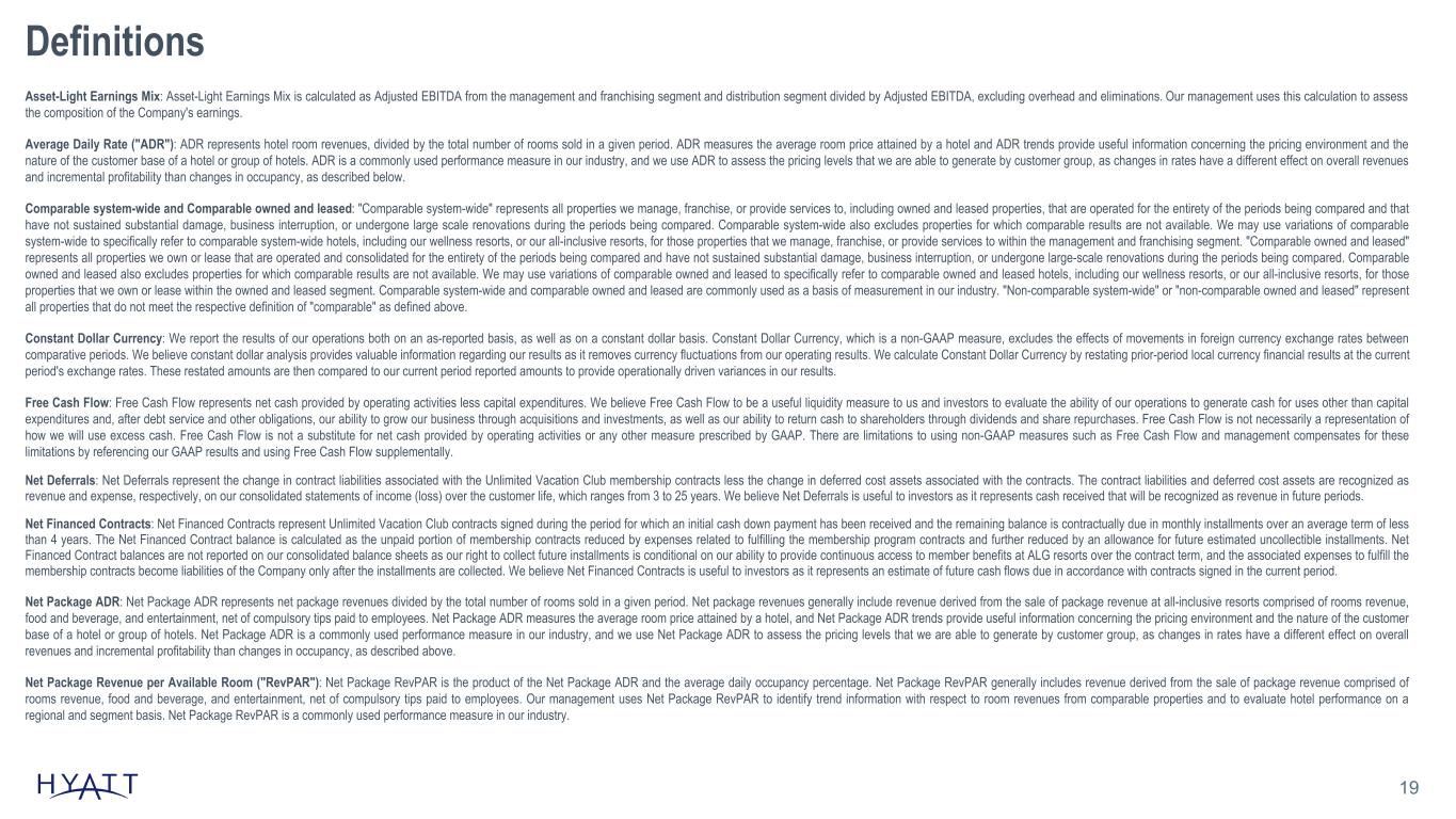 18 Definitions Adjusted Earnings Before Interest Expense, Taxes, Depreciation, and Amortization ("Adjusted EBITDA"): We use the term Adjusted EBITDA throughout this earnings release. Adjusted EBITDA, as we define it, is a measure that is not recognized in accordance with accounting principles generally accepted in the United States of America ("GAAP"). We define consolidated Adjusted EBITDA as net income (loss) attributable to Hyatt Hotels Corporation plus our pro rata share of unconsolidated owned and leased hospitality ventures' Adjusted EBITDA based on our ownership percentage of each owned and leased venture, adjusted to exclude the following items: • interest expense; • benefit (provision) for income taxes; • depreciation and amortization; • amortization of management and hotel services agreement and franchise agreement assets and performance cure payments, which constitute payments to customers ("Contra revenue"); • revenues for reimbursed costs; • reimbursed costs that we intend to recover over the long term; • transaction and integration costs; • equity earnings (losses) from unconsolidated hospitality ventures; • stock-based compensation expense; • gains (losses) on sales of real estate and other; • asset impairments; and • other income (loss), net. We calculate consolidated Adjusted EBITDA by adding the Adjusted EBITDA of each of our reportable segments and eliminations to overhead Adjusted EBITDA. Our board of directors and executive management team focus on Adjusted EBITDA as one of the key performance and compensation measures both on a segment and on a consolidated basis. Adjusted EBITDA assists us in comparing our performance over various reporting periods on a consistent basis because it removes from our operating results the impact of items that do not reflect our core operations both on a segment and on a consolidated basis. Our President and Chief Executive Officer, who is our chief operating decision maker, also evaluates the performance of each of our reportable segments and determines how to allocate resources to those segments, in part, by assessing the Adjusted EBITDA of each segment. In addition, the compensation committee of our board of directors determines the annual variable compensation for certain members of our management based in part on consolidated Adjusted EBITDA, segment Adjusted EBITDA, or some combination of both. We believe Adjusted EBITDA is useful to investors because it provides investors with the same information that we use internally for purposes of assessing our operating performance and making compensation decisions and facilitates our comparison of results with results from other companies within our industry. Adjusted EBITDA excludes certain items that can vary widely across different industries and among companies within the same industry, including interest expense and benefit (provision) for income taxes, which are dependent on company specifics, including capital structure, credit ratings, tax policies, and jurisdictions in which they operate; depreciation and amortization, which are dependent on company policies including how the assets are utilized as well as the lives assigned to the assets; Contra revenue, which is dependent on company policies and strategic decisions regarding payments to hotel owners; and stock-based compensation expense, which varies among companies as a result of different compensation plans companies have adopted. We exclude revenues for reimbursed costs and reimbursed costs which relate to the reimbursement of payroll costs and for system-wide services and programs that we operate for the benefit of our hotel owners as contractually we do not provide services or operate the related programs to generate a profit over the terms of the respective contracts. Over the long term, these programs and services are not designed to impact our economics, either positively or negatively. Therefore, we exclude the net impact when evaluating period-over-period changes in our operating results. Adjusted EBITDA includes reimbursed costs related to system-wide services and programs that we do not intend to recover from hotel owners. Finally, we exclude other items that are not core to our operations and may vary in frequency or magnitude, such as transaction and integration costs, asset impairments, unrealized and realized gains and losses on marketable securities, and gains and losses on sales of real estate and other. Adjusted EBITDA is not a substitute for net income (loss) attributable to Hyatt Hotels Corporation, net income (loss), or any other measure prescribed by GAAP. There are limitations to using non-GAAP measures such as Adjusted EBITDA. Although we believe that Adjusted EBITDA can make an evaluation of our operating performance more consistent because it removes items that do not reflect our core operations, other companies in our industry may define Adjusted EBITDA differently than we do. As a result, it may be difficult to use Adjusted EBITDA or similarly named non-GAAP measures that other companies may use to compare the performance of those companies to our performance. Because of these limitations, Adjusted EBITDA should not be considered as a measure of the income (loss) generated by our business. Our management compensates for these limitations by referencing our GAAP results and using Adjusted EBITDA supplementally. Adjusted General and Administrative ("G&A") Expenses: Adjusted G&A Expenses, as we define it, is a non-GAAP measure. Adjusted G&A Expenses exclude the impact of deferred compensation plans funded through rabbi trusts and stock-based compensation expense. Adjusted G&A Expenses assist us in comparing our performance over various reporting periods on a consistent basis because it removes from our operating results the impact of items that do not reflect our core operations, both on a segment and consolidated basis.