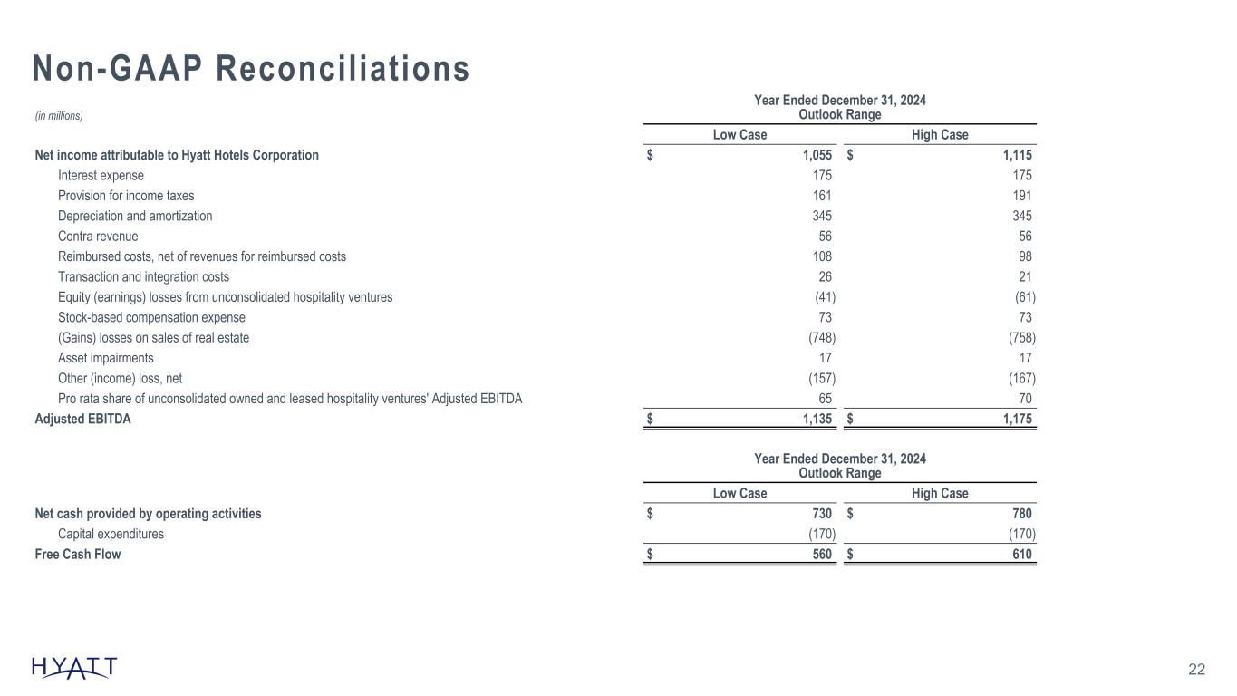 Non-GAAP Reconciliations 21 (in millions) Year Ended December 31, 2023 Net cash provided by operating activities $ 800 Capital expenditures (198) Free Cash Flow $ 602 (in millions) Three Months Ended June 30, Six Months Ended June 30, 2024 2023 2024 2023 Net income attributable to Hyatt Hotels Corporation $ 359 $ 68 $ 881 $ 126 Interest expense 40 31 78 64 Provision for income taxes 103 27 122 74 Depreciation and amortization 84 99 176 197 Contra revenue 16 12 29 22 Revenues for reimbursed costs (842) (784) (1,644) (1,513) Reimbursed costs 853 789 1,689 1,538 Transaction and integration costs (a) 10 10 18 23 Equity (earnings) losses from unconsolidated hospitality ventures 30 1 (45) 3 Stock-based compensation expense (b) 15 16 46 48 (Gains) losses on sales of real estate and other (350) — (753) — Asset impairments — 5 17 7 Other (income) loss, net (28) (12) (82) (67) Pro rata share of unconsolidated owned and leased hospitality ventures' Adjusted EBITDA 17 17 34 31 Adjusted EBITDA $ 307 $ 279 $ 566 $ 553 Source Notes: linked to ER schedule ( a ) D u r i n g t h e t h r e e m o n t h s e n d e d J u n e 3 0 , 2 0 2 4 , t h e C o m p a n y r e v i s e d i t s d e f i n i t i o n o f A d j u s t e d E B I T D A t o e x c l u d e t r a n s a c t i o n a n d i n t e g r a t i o n c o s t s , a n d i t r e c a s t p r i o r - p e r i o d r e s u l t s t o p r o v i d e c o m p a r a b i l i t y . T h e r e v i s e d d e f i n i t i o n e x c l u d e s t r a n s a c t i o n c o s t s p r e v i o u s l y r e c o g n i z e d i n g e n e r a l a n d a d m i n i s t r a t i v e e x p e n s e s a n d i n t e g r a t i o n c o s t s . P r e v i o u s l y , o n l y t r a n s a c t i o n c o s t s r e c o g n i z e d i n g a i n s ( l o s s e s ) o n s a l e s o f r e a l e s t a t e a n d o t h e r a n d o t h e r i n c o m e ( l o s s ) , n e t w e r e e x c l u d e d f r o m A d j u s t e d E B I T D A . A s t h e s e c o s t s m a y v a r y i n f r e q u e n c y o r m a g n i t u d e , t h e C o m p a n y b e l i e v e s t h e r e v i s e d d e f i n i t i o n p r e s e n t s a m o r e r e p r e s e n t a t i v e m e a s u r e o f i t s c o r e o p e r a t i o n s , a s s i s t s i n t h e c o m p a r a b i l i t y o f r e s u l t s , a n d p r o v i d e s i n f o r m a t i o n c o n s i s t e n t w i t h h o w i t s m a n a g e m e n t e v a l u a t e s o p e r a t i n g p e r f o r m a n c e . R e f e r t o t h e a p p e n d i x f o r d e f i n i t i o n s . ( b ) I n c l u d e s a m o u n t s r e c o g n i z e d i n g e n e r a l a n d a d m i n i s t r a t i v e e x p e n s e s a n d d i s t r i b u t i o n e x p e n s e s .