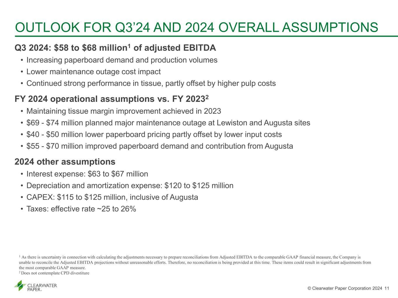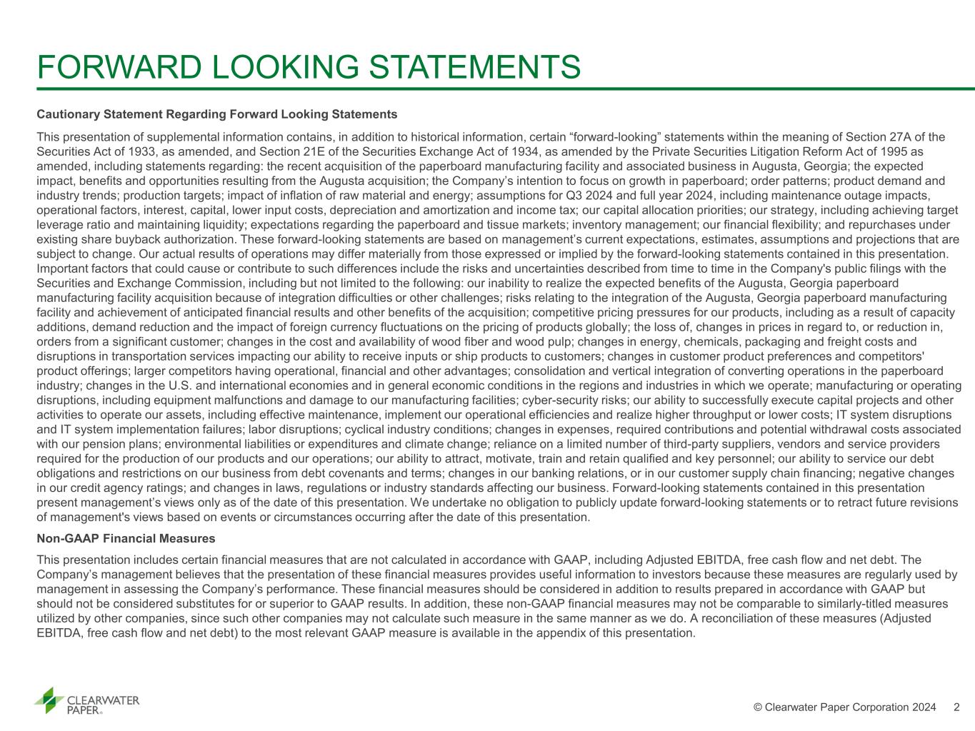 Cautionary Statement Regarding Forward Looking Statements This presentation of supplemental information contains, in addition to historical information, certain “forward-looking” statements within the meaning of Section 27A of the Securities Act of 1933, as amended, and Section 21E of the Securities Exchange Act of 1934, as amended by the Private Securities Litigation Reform Act of 1995 as amended, including statements regarding: the recent acquisition of the paperboard manufacturing facility and associated business in Augusta, Georgia; the expected impact, benefits and opportunities resulting from the Augusta acquisition; the Company’s intention to focus on growth in paperboard; order patterns; product demand and industry trends; production targets; impact of inflation of raw material and energy; assumptions for Q3 2024 and full year 2024, including maintenance outage impacts, operational factors, interest, capital, lower input costs, depreciation and amortization and income tax; our capital allocation priorities; our strategy, including achieving target leverage ratio and maintaining liquidity; expectations regarding the paperboard and tissue markets; inventory management; our financial flexibility; and repurchases under existing share buyback authorization. These forward-looking statements are based on management’s current expectations, estimates, assumptions and projections that are subject to change. Our actual results of operations may differ materially from those expressed or implied by the forward-looking statements contained in this presentation. Important factors that could cause or contribute to such differences include the risks and uncertainties described from time to time in the Company's public filings with the Securities and Exchange Commission, including but not limited to the following: our inability to realize the expected benefits of the Augusta, Georgia paperboard manufacturing facility acquisition because of integration difficulties or other challenges; risks relating to the integration of the Augusta, Georgia paperboard manufacturing facility and achievement of anticipated financial results and other benefits of the acquisition; competitive pricing pressures for our products, including as a result of capacity additions, demand reduction and the impact of foreign currency fluctuations on the pricing of products globally; the loss of, changes in prices in regard to, or reduction in, orders from a significant customer; changes in the cost and availability of wood fiber and wood pulp; changes in energy, chemicals, packaging and freight costs and disruptions in transportation services impacting our ability to receive inputs or ship products to customers; changes in customer product preferences and competitors' product offerings; larger competitors having operational, financial and other advantages; consolidation and vertical integration of converting operations in the paperboard industry; changes in the U.S. and international economies and in general economic conditions in the regions and industries in which we operate; manufacturing or operating disruptions, including equipment malfunctions and damage to our manufacturing facilities; cyber-security risks; our ability to successfully execute capital projects and other activities to operate our assets, including effective maintenance, implement our operational efficiencies and realize higher throughput or lower costs; IT system disruptions and IT system implementation failures; labor disruptions; cyclical industry conditions; changes in expenses, required contributions and potential withdrawal costs associated with our pension plans; environmental liabilities or expenditures and climate change; reliance on a limited number of third-party suppliers, vendors and service providers required for the production of our products and our operations; our ability to attract, motivate, train and retain qualified and key personnel; our ability to service our debt obligations and restrictions on our business from debt covenants and terms; changes in our banking relations, or in our customer supply chain financing; negative changes in our credit agency ratings; and changes in laws, regulations or industry standards affecting our business. Forward-looking statements contained in this presentation present management’s views only as of the date of this presentation. We undertake no obligation to publicly update forward-looking statements or to retract future revisions of management's views based on events or circumstances occurring after the date of this presentation. Non-GAAP Financial Measures This presentation includes certain financial measures that are not calculated in accordance with GAAP, including Adjusted EBITDA, free cash flow and net debt. The Company’s management believes that the presentation of these financial measures provides useful information to investors because these measures are regularly used by management in assessing the Company’s performance. These financial measures should be considered in addition to results prepared in accordance with GAAP but should not be considered substitutes for or superior to GAAP results. In addition, these non-GAAP financial measures may not be comparable to similarly-titled measures utilized by other companies, since such other companies may not calculate such measure in the same manner as we do. A reconciliation of these measures (Adjusted EBITDA, free cash flow and net debt) to the most relevant GAAP measure is available in the appendix of this presentation. FORWARD LOOKING STATEMENTS © Clearwater Paper Corporation 2024 2