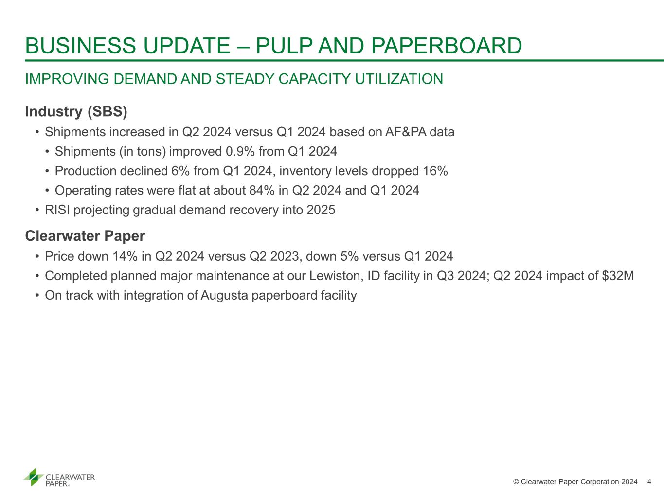 Overall • Net sales $586 million, up 12% versus Q2 2023 • Net loss $26 million compared to net income $30 million in Q2 2023 • Adjusted EBITDA $35 million compared to $72 million in Q2 2023 Pulp and Paperboard • SBS prices down 14% versus Q2 2023, 5% lower versus Q1 2024 • Completed acquisition of Augusta paperboard facility; on track with integration • $32 million impact from the planned major maintenance at Lewiston pulp and paperboard facility Consumer Products • Tissue prices down 3% versus Q2 2023, 1% lower than Q1 2024 • Demand for private branded products remained strong • Strong operational performance and reduced input costs Capital Structure • Continued to maintain strong financial flexibility • Repurchased $3 million of stock to offset dilution, with $3 million remaining authorized under our stock repurchase program Q2 2024 BUSINESS HIGHLIGHTS © Clearwater Paper Corporation 2024 3
