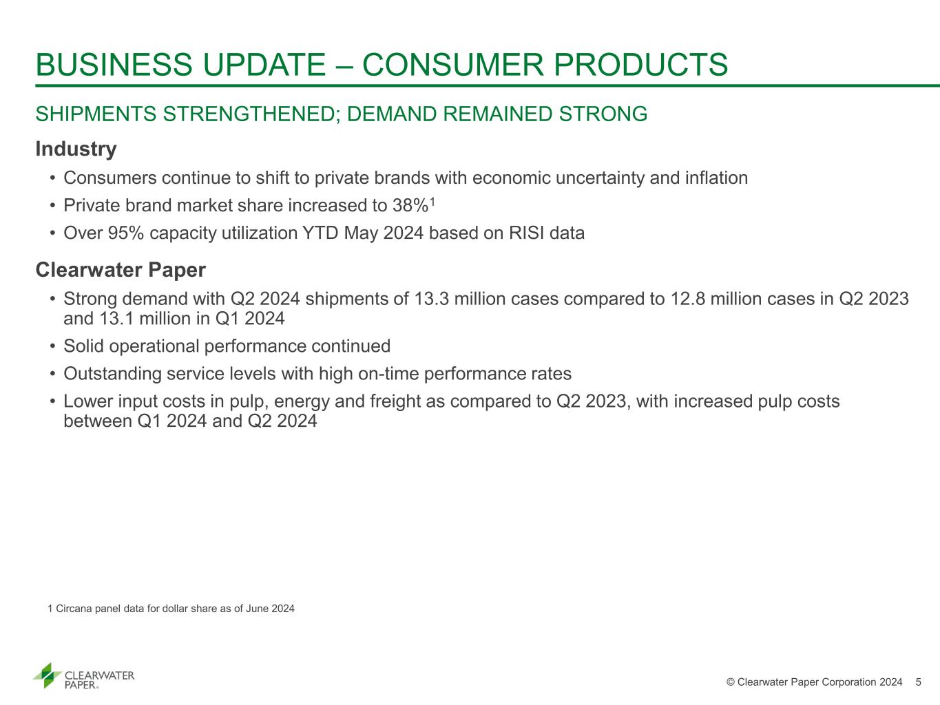 Industry (SBS) • Shipments increased in Q2 2024 versus Q1 2024 based on AF&PA data • Shipments (in tons) improved 0.9% from Q1 2024 • Production declined 6% from Q1 2024, inventory levels dropped 16% • Operating rates were flat at about 84% in Q2 2024 and Q1 2024 • RISI projecting gradual demand recovery into 2025 Clearwater Paper • Price down 14% in Q2 2024 versus Q2 2023, down 5% versus Q1 2024 • Completed planned major maintenance at our Lewiston, ID facility in Q3 2024; Q2 2024 impact of $32M • On track with integration of Augusta paperboard facility BUSINESS UPDATE – PULP AND PAPERBOARD IMPROVING DEMAND AND STEADY CAPACITY UTILIZATION © Clearwater Paper Corporation 2024 4