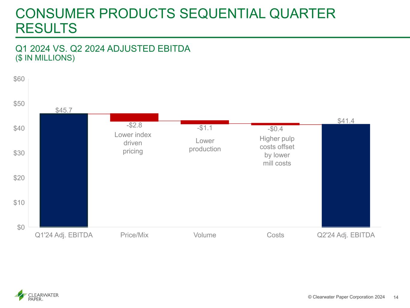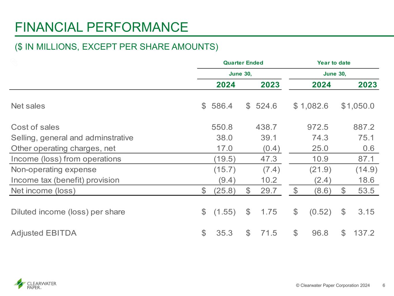 For the first six months of 2024, Clearwater Paper reported net sales of $1.1 billion, a 3% increase compared to net sales of $1 billion for the first six months of 2023. Clearwater Paper reported a net loss for the first six months of 2024 of $9 million, or $0.52 per diluted share, compared to net income for the first six months of 2023 of $54 million, or $3.15 per diluted share. Adjusted EBITDA for the first six months of 2024 was $97 million, compared to the first six months of 2023 Adjusted EBITDA of $137 million.