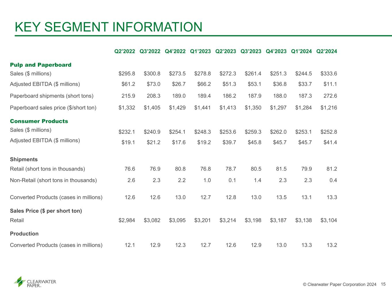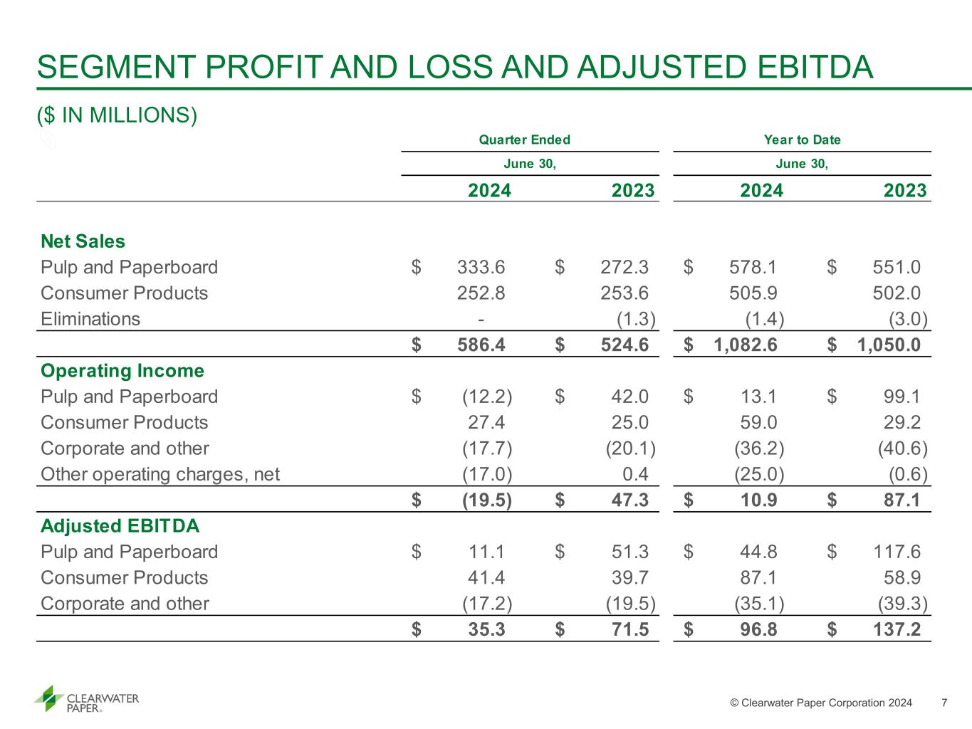© Clearwater Paper Corporation 2024 SEGMENT PROFIT AND LOSS AND ADJUSTED EBITDA ($ IN MILLIONS) 2024 2023 2024 2023 Net Sales Pulp and Paperboard 333.6$ 272.3$ 578.1$ 551.0$ Consumer Products 252.8 253.6 505.9 502.0 Eliminations - (1.3) (1.4) (3.0) 586.4$ 524.6$ 1,082.6$ 1,050.0$ Operating Income Pulp and Paperboard (12.2)$ 42.0$ 13.1$ 99.1$ Consumer Products 27.4 25.0 59.0 29.2 Corporate and other (17.7) (20.1) (36.2) (40.6) Other operating charges, net (17.0) 0.4 (25.0) (0.6) (19.5)$ 47.3$ 10.9$ 87.1$ Adjusted EBITDA Pulp and Paperboard 11.1$ 51.3$ 44.8$ 117.6$ Consumer Products 41.4 39.7 87.1 58.9 Corporate and other (17.2) (19.5) (35.1) (39.3) 35.3$ 71.5$ 96.8$ 137.2$ June 30, June 30, Quarter Ended Year to Date 7