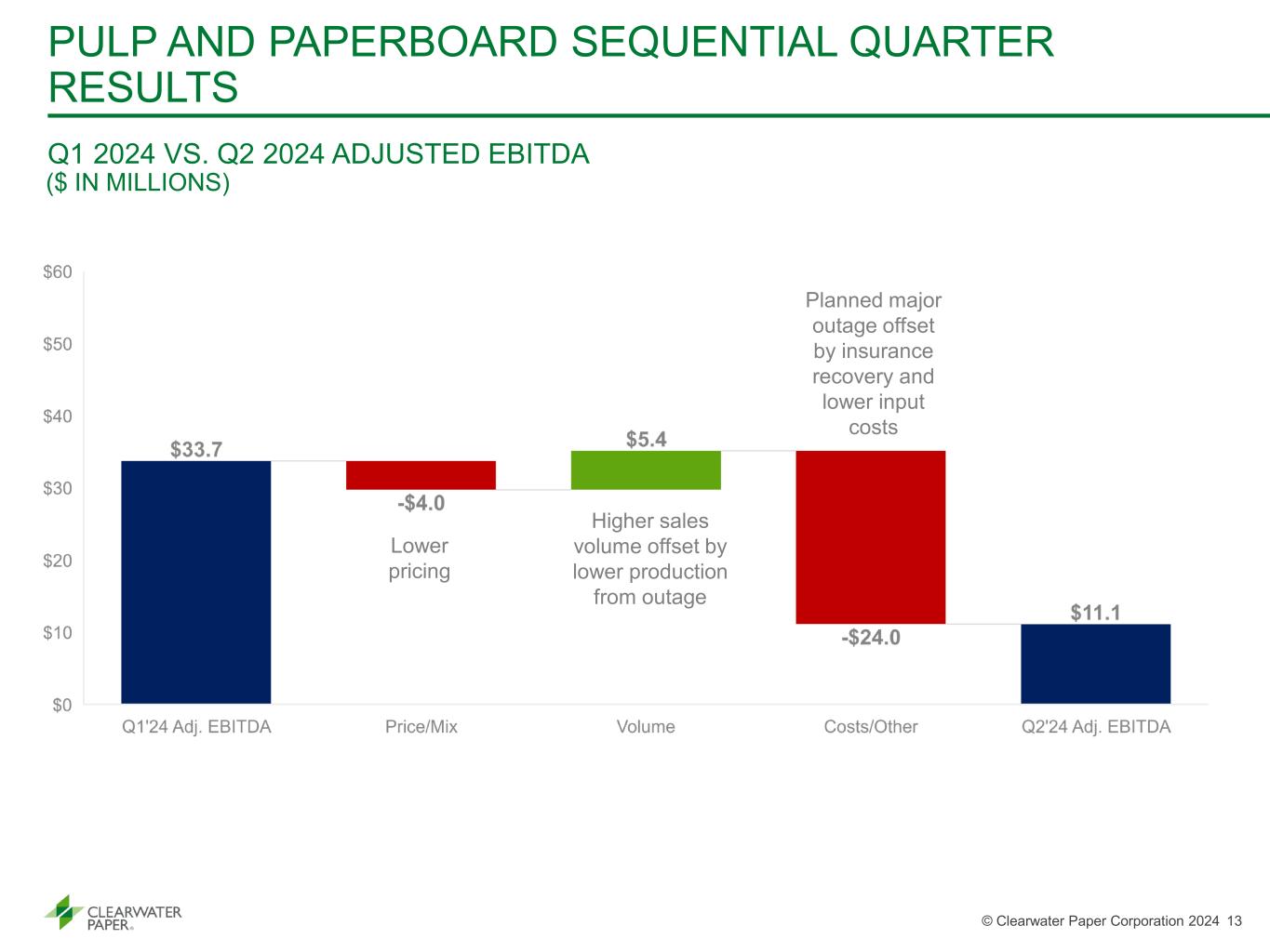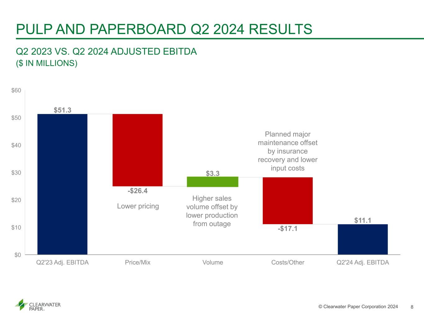 Net sales in the Pulp and Paperboard segment were $334 million for the second quarter of 2024, up 23% compared to second quarter 2023 net sales of $272 million. Segment operating loss for the second quarter of 2024 was $12 million, compared to operating income of $42 million for the second quarter of 2023. Adjusted EBITDA for the segment was $11 million in the second quarter of 2024, compared to $51 million in the second quarter of 2023. The decrease in operating income and Adjusted EBITDA was driven by lower sales prices and the impacts of the company's planned major maintenance outage at its Lewiston, Idaho facility, partially offset by lower wood costs and an insurance recovery