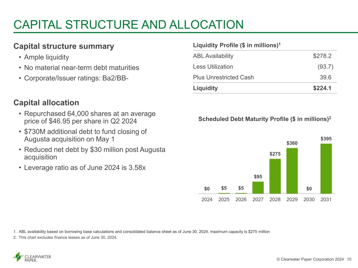 © Clearwater Paper Corporation 2024 CAPITAL STRUCTURE AND ALLOCATION Capital structure summary • Ample liquidity • No material near-term debt maturities • Corporate/Issuer ratings: Ba2/BB- Capital allocation • Repurchased 64,000 shares at an average price of $46.95 per share in Q2 2024 • $730M additional debt to fund closing of Augusta acquisition on May 1 • Reduced net debt by $30 million post Augusta acquisition • Leverage ratio as of June 2024 is 3.58x $0 $5 $5 $95 $275 $360 $0 $395 2024 2025 2026 2027 2028 2029 2030 2031 Scheduled Debt Maturity Profile ($ in millions)2 Liquidity Profile ($ in millions)1 ABL Availability $278.2 Less Utilization (93.7) Plus Unrestricted Cash 39.6 Liquidity $224.1 1. ABL availability based on borrowing base calculations and consolidated balance sheet as of June 30, 2024, maximum capacity is $275 million 2. This chart excludes finance leases as of June 30, 2024. 10