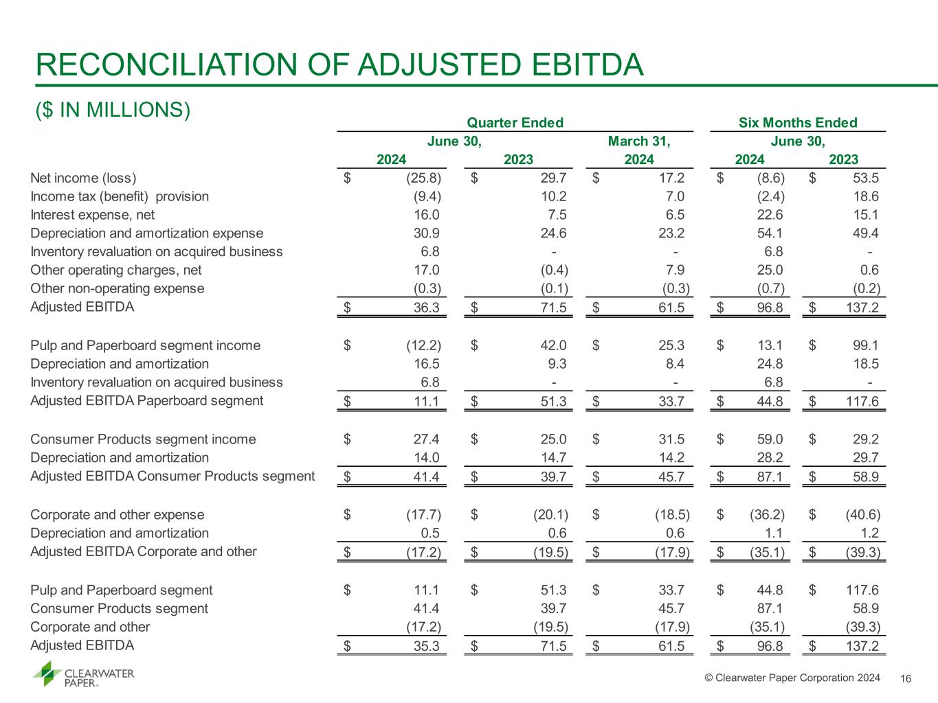 RECONCILIATION OF ADJUSTED EBITDA ($ IN MILLIONS) March 31, 2024 2023 2024 2024 2023 Net income (loss) $ (25.8) $ 29.7 $ 17.2 $ (8.6) $ 53.5 Income tax (benefit) provision (9.4) 10.2 7.0 (2.4) 18.6 Interest expense, net 16.0 7.5 6.5 22.6 15.1 Depreciation and amortization expense 30.9 24.6 23.2 54.1 49.4 Inventory revaluation on acquired business 6.8 - - 6.8 - Other operating charges, net 17.0 (0.4) 7.9 25.0 0.6 Other non-operating expense (0.3) (0.1) (0.3) (0.7) (0.2) Adjusted EBITDA $ 36.3 $ 71.5 $ 61.5 $ 96.8 $ 137.2 Pulp and Paperboard segment income $ (12.2) $ 42.0 $ 25.3 $ 13.1 $ 99.1 Depreciation and amortization 16.5 9.3 8.4 24.8 18.5 Inventory revaluation on acquired business 6.8 - - 6.8 - Adjusted EBITDA Paperboard segment $ 11.1 $ 51.3 $ 33.7 $ 44.8 $ 117.6 Consumer Products segment income $ 27.4 $ 25.0 $ 31.5 $ 59.0 $ 29.2 Depreciation and amortization 14.0 14.7 14.2 28.2 29.7 Adjusted EBITDA Consumer Products segment $ 41.4 $ 39.7 $ 45.7 $ 87.1 $ 58.9 Corporate and other expense $ (17.7) $ (20.1) $ (18.5) $ (36.2) $ (40.6) Depreciation and amortization 0.5 0.6 0.6 1.1 1.2 Adjusted EBITDA Corporate and other $ (17.2) $ (19.5) $ (17.9) $ (35.1) $ (39.3) Pulp and Paperboard segment $ 11.1 $ 51.3 $ 33.7 $ 44.8 $ 117.6 Consumer Products segment 41.4 39.7 45.7 87.1 58.9 Corporate and other (17.2) (19.5) (17.9) (35.1) (39.3) Adjusted EBITDA $ 35.3 $ 71.5 $ 61.5 $ 96.8 $ 137.2 June 30, June 30, Six Months EndedQuarter Ended © Clearwater Paper Corporation 2024 16