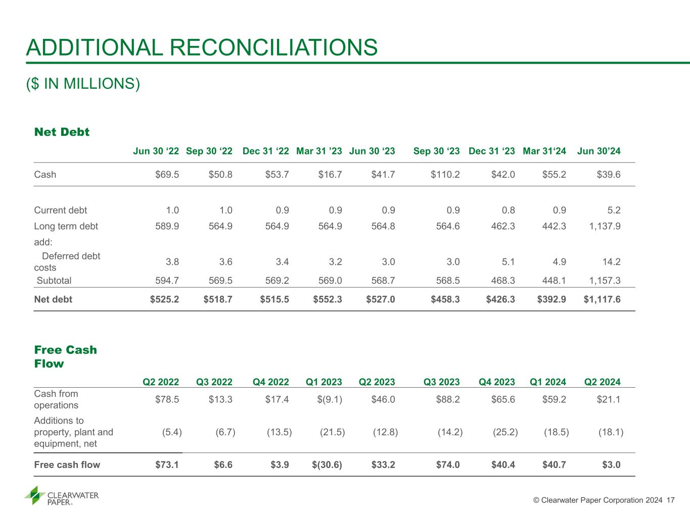 ADDITIONAL RECONCILIATIONS Net Debt Jun 30 ‘22 Sep 30 ‘22 Dec 31 ‘22 Mar 31 ’23 Jun 30 ‘23 Sep 30 ‘23 Dec 31 ‘23 Mar 31‘24 Jun 30’24 Cash $69.5 $50.8 $53.7 $16.7 $41.7 $110.2 $42.0 $55.2 $39.6 Current debt 1.0 1.0 0.9 0.9 0.9 0.9 0.8 0.9 5.2 Long term debt 589.9 564.9 564.9 564.9 564.8 564.6 462.3 442.3 1,137.9 add: Deferred debt costs 3.8 3.6 3.4 3.2 3.0 3.0 5.1 4.9 14.2 Subtotal 594.7 569.5 569.2 569.0 568.7 568.5 468.3 448.1 1,157.3 Net debt $525.2 $518.7 $515.5 $552.3 $527.0 $458.3 $426.3 $392.9 $1,117.6 Free Cash Flow Q2 2022 Q3 2022 Q4 2022 Q1 2023 Q2 2023 Q3 2023 Q4 2023 Q1 2024 Q2 2024 Cash from operations $78.5 $13.3 $17.4 $(9.1) $46.0 $88.2 $65.6 $59.2 $21.1 Additions to property, plant and equipment, net (5.4) (6.7) (13.5) (21.5) (12.8) (14.2) (25.2) (18.5) (18.1) Free cash flow $73.1 $6.6 $3.9 $(30.6) $33.2 $74.0 $40.4 $40.7 $3.0 ($ IN MILLIONS) © Clearwater Paper Corporation 2024 17
