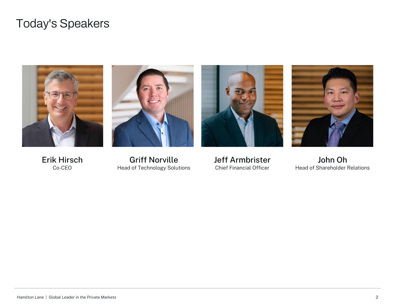 2Hamilton Lane | Global Leader in the Private Markets Griff Norville Head of Technology Solutions Today's Speakers Erik Hirsch Co-CEO Jeff Armbrister Chief Financial Officer John Oh Head of Shareholder Relations