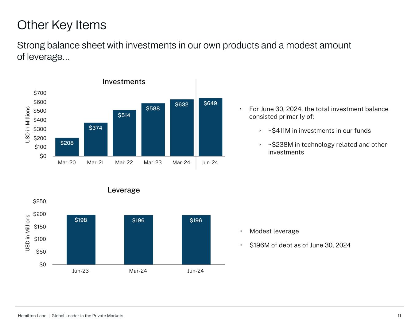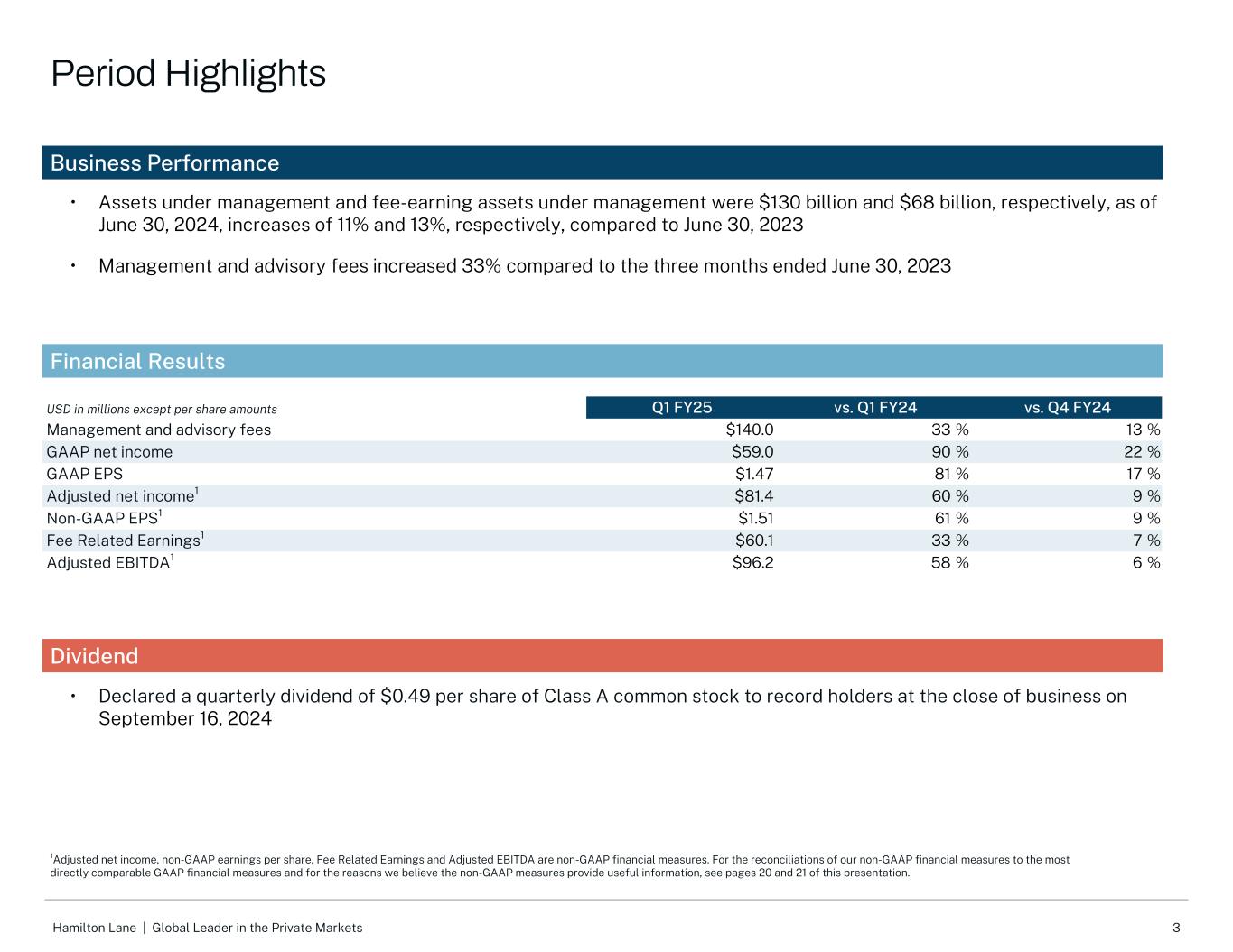 22Hamilton Lane | Global Leader in the Private Markets Some of the statements in this presentation may constitute "forward-looking statements" within the meaning of Section 27A of the Securities Act of 1933, Section 21E of the Securities Exchange Act of 1934 and the Private Securities Litigation Reform Act of 1995. Words such as "will", "expect", "believe", "estimate", "continue", "anticipate", "intend", "plan", and similar expressions are intended to identify these forward-looking statements. Forward-looking statements discuss management's current expectations and projections relating to our financial position, results of operations, plans, objectives, future performance and business. All forward-looking statements are subject to known and unknown risks, uncertainties and other important factors that may cause actual results to be materially different, including risks relating to: our ability to manage growth, fund performance, competition in our industry, changes in our regulatory environment and tax status; market conditions generally; our ability to access suitable investment opportunities for our clients; our ability to maintain our fee structure; our ability to attract and retain key employees; our ability to manage our obligations under our debt agreements; defaults by clients and third-party investors on their obligations to fund commitments; our exposure and that of our clients and investors to the credit risks of financial institutions at which we and they hold accounts; our ability to comply with investment guidelines set by our clients; our ability to successfully integrate acquired businesses with ours; our ability to manage risks associated with introducing new types of investment structures, products or services or entering into strategic partnerships; our ability to manage redemption or repurchase rights in certain of our funds; our ability to manage, identify and anticipate risks we face; our ability to manage the effects of events outside of our control; and our ability to receive distributions from Hamilton Lane Advisors, L.L.C. to fund our payment of dividends, taxes and other expenses. The foregoing list of factors is not exhaustive. For more information regarding these risks and uncertainties as well as additional risks we face, you should refer to the "Risk Factors" detailed in Part I, Item 1A of our Annual Report on Form 10-K for the fiscal year ended March 31, 2024 and in our subsequent reports filed from time to time with the Securities and Exchange Commission. The forward-looking statements included in this presentation are made only as of the date presented. We undertake no obligation to update or revise any forward-looking statement as a result of new information or future events, except as otherwise required by law. Values appearing in this presentation that are whole numbers are rounded approximations. As of August 6, 2024 Disclosures