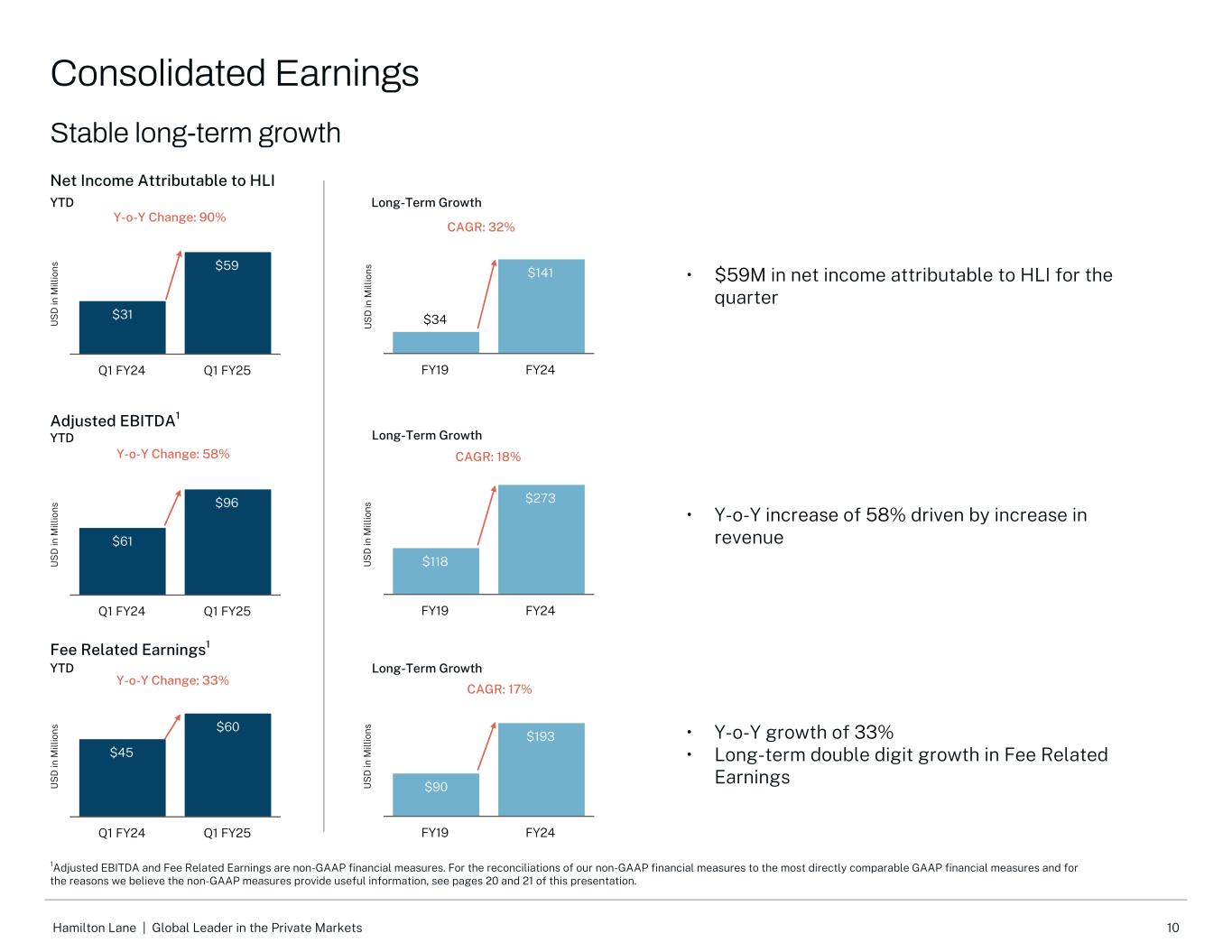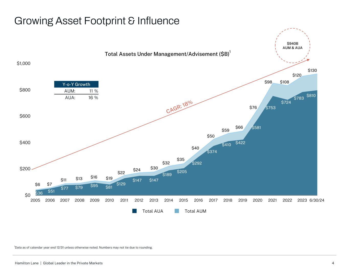 3Hamilton Lane | Global Leader in the Private Markets Business Performance Financial Results Dividend • Assets under management and fee-earning assets under management were $130 billion and $68 billion, respectively, as of June 30, 2024, increases of 11% and 13%, respectively, compared to June 30, 2023 • Management and advisory fees increased 33% compared to the three months ended June 30, 2023 USD in millions except per share amounts Q1 FY25 vs. Q1 FY24 vs. Q4 FY24 Management and advisory fees $140.0 33 % 13 % GAAP net income $59.0 90 % 22 % GAAP EPS $1.47 81 % 17 % Adjusted net income1 $81.4 60 % 9 % Non-GAAP EPS1 $1.51 61 % 9 % Fee Related Earnings1 $60.1 33 % 7 % Adjusted EBITDA1 $96.2 58 % 6 % • Declared a quarterly dividend of $0.49 per share of Class A common stock to record holders at the close of business on September 16, 2024 1Adjusted net income, non-GAAP earnings per share, Fee Related Earnings and Adjusted EBITDA are non-GAAP financial measures. For the reconciliations of our non-GAAP financial measures to the most directly comparable GAAP financial measures and for the reasons we believe the non-GAAP measures provide useful information, see pages 20 and 21 of this presentation. Period Highlights