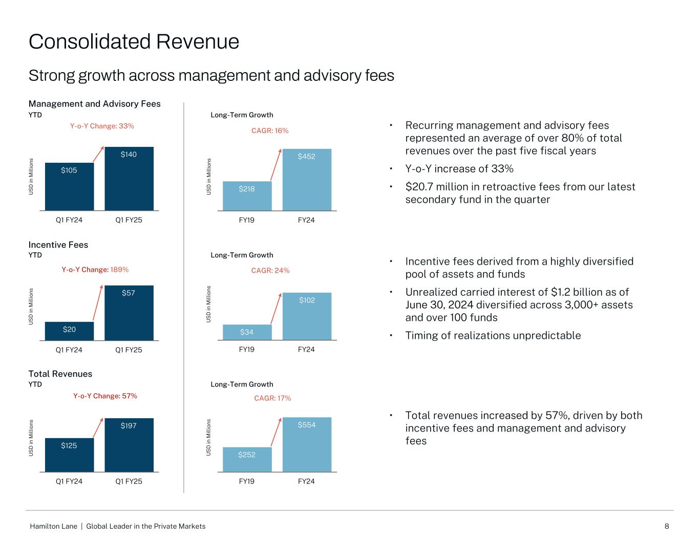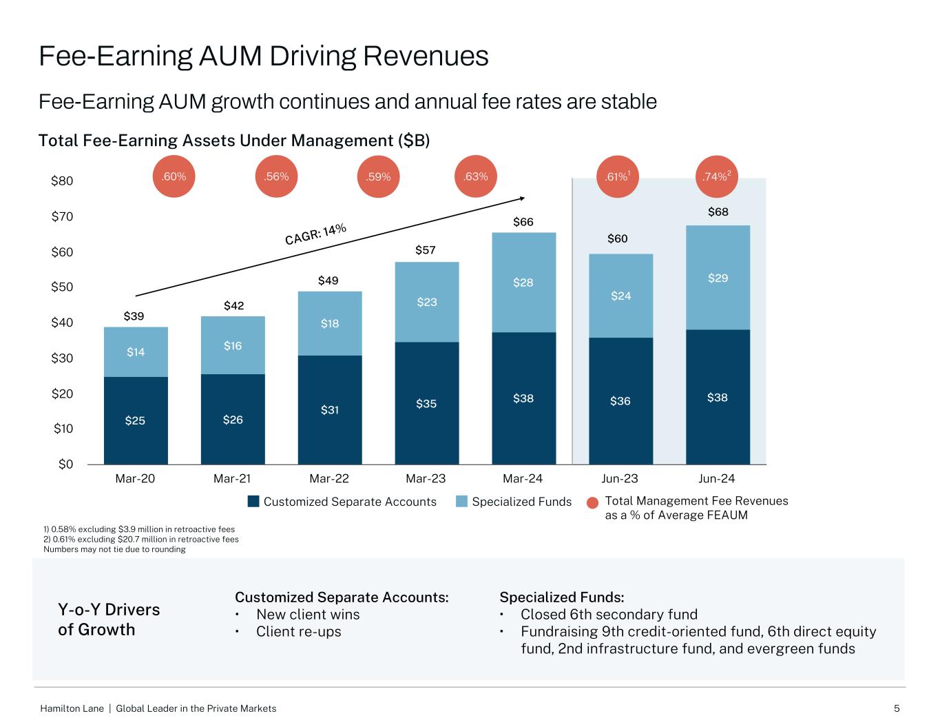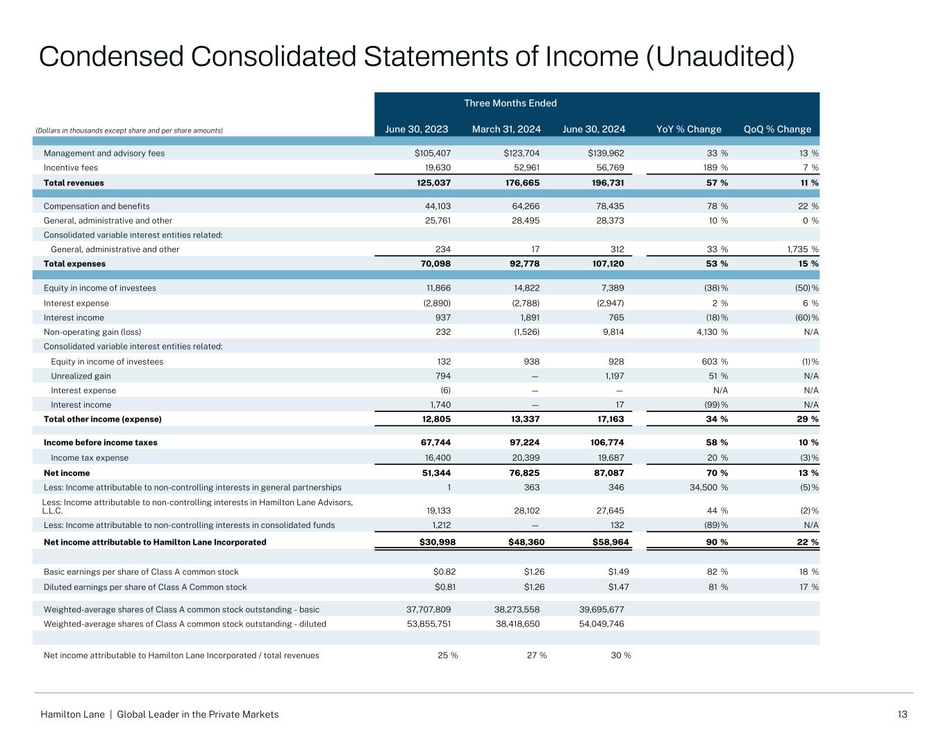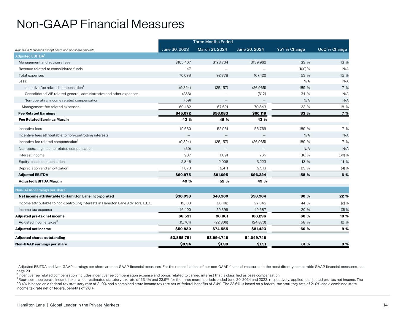 13Hamilton Lane | Global Leader in the Private Markets Condensed Consolidated Statements of Income (Unaudited) Three Months Ended (Dollars in thousands except share and per share amounts) June 30, 2023 March 31, 2024 June 30, 2024 YoY % Change QoQ % Change Management and advisory fees $105,407 $123,704 $139,962 33 % 13 % Incentive fees 19,630 52,961 56,769 189 % 7 % Total revenues 125,037 176,665 196,731 57 % 11 % Compensation and benefits 44,103 64,266 78,435 78 % 22 % General, administrative and other 25,761 28,495 28,373 10 % 0 % Consolidated variable interest entities related: General, administrative and other 234 17 312 33 % 1,735 % Total expenses 70,098 92,778 107,120 53 % 15 % Equity in income of investees 11,866 14,822 7,389 (38) % (50) % Interest expense (2,890) (2,788) (2,947) 2 % 6 % Interest income 937 1,891 765 (18) % (60) % Non-operating gain (loss) 232 (1,526) 9,814 4,130 % N/A Consolidated variable interest entities related: Equity in income of investees 132 938 928 603 % (1) % Unrealized gain 794 — 1,197 51 % N/A Interest expense (6) — — N/A N/A Interest income 1,740 — 17 (99) % N/A Total other income (expense) 12,805 13,337 17,163 34 % 29 % Income before income taxes 67,744 97,224 106,774 58 % 10 % Income tax expense 16,400 20,399 19,687 20 % (3) % Net income 51,344 76,825 87,087 70 % 13 % Less: Income attributable to non-controlling interests in general partnerships 1 363 346 34,500 % (5) % Less: Income attributable to non-controlling interests in Hamilton Lane Advisors, L.L.C. 19,133 28,102 27,645 44 % (2) % Less: Income attributable to non-controlling interests in consolidated funds 1,212 — 132 (89) % N/A Net income attributable to Hamilton Lane Incorporated $30,998 $48,360 $58,964 90 % 22 % Basic earnings per share of Class A common stock $0.82 $1.26 $1.49 82 % 18 % Diluted earnings per share of Class A Common stock $0.81 $1.26 $1.47 81 % 17 % Weighted-average shares of Class A common stock outstanding - basic 37,707,809 38,273,558 39,695,677 Weighted-average shares of Class A common stock outstanding - diluted 53,855,751 38,418,650 54,049,746 Net income attributable to Hamilton Lane Incorporated / total revenues 25 % 27 % 30 %