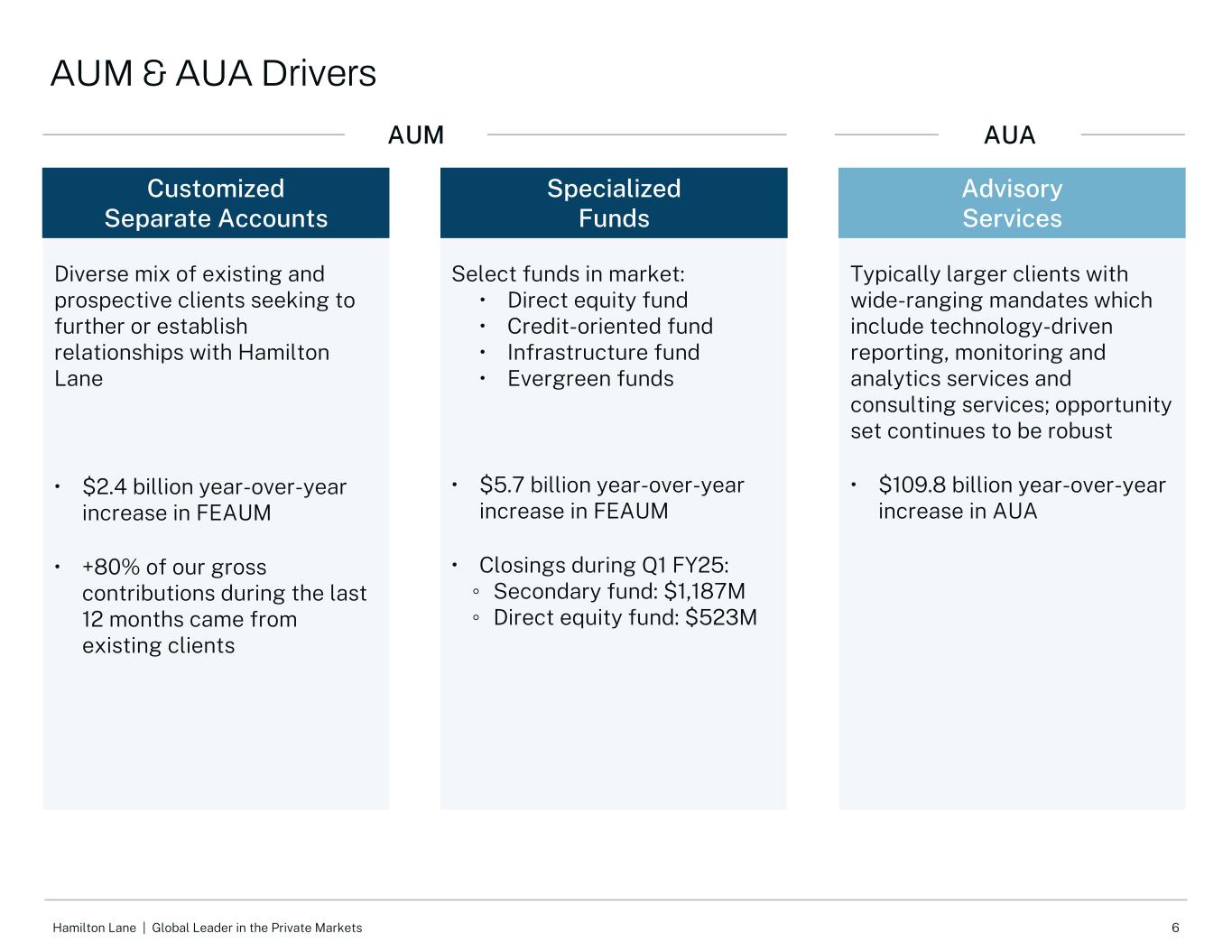 5Hamilton Lane | Global Leader in the Private Markets Y-o-Y Drivers of Growth Total Fee-Earning Assets Under Management ($B) $25 $26 $31 $35 $38 $36 $38 $14 $16 $18 $23 $28 $24 $29 Customized Separate Accounts Specialized Funds Mar-20 Mar-21 Mar-22 Mar-23 Mar-24 Jun-23 Jun-24 $0 $10 $20 $30 $40 $50 $60 $70 $80 Fee-Earning AUM growth continues and annual fee rates are stable CAGR: 14% 1) 0.58% excluding $3.9 million in retroactive fees 2) 0.61% excluding $20.7 million in retroactive fees Numbers may not tie due to rounding Total Management Fee Revenues as a % of Average FEAUM Customized Separate Accounts: • New client wins • Client re-ups Specialized Funds: • Closed 6th secondary fund • Fundraising 9th credit-oriented fund, 6th direct equity fund, 2nd infrastructure fund, and evergreen funds .60% $42 $60 $57 $39 $49 $68 Fee-Earning AUM Driving Revenues .56% .59% .63% .61%1 .74%2 $66