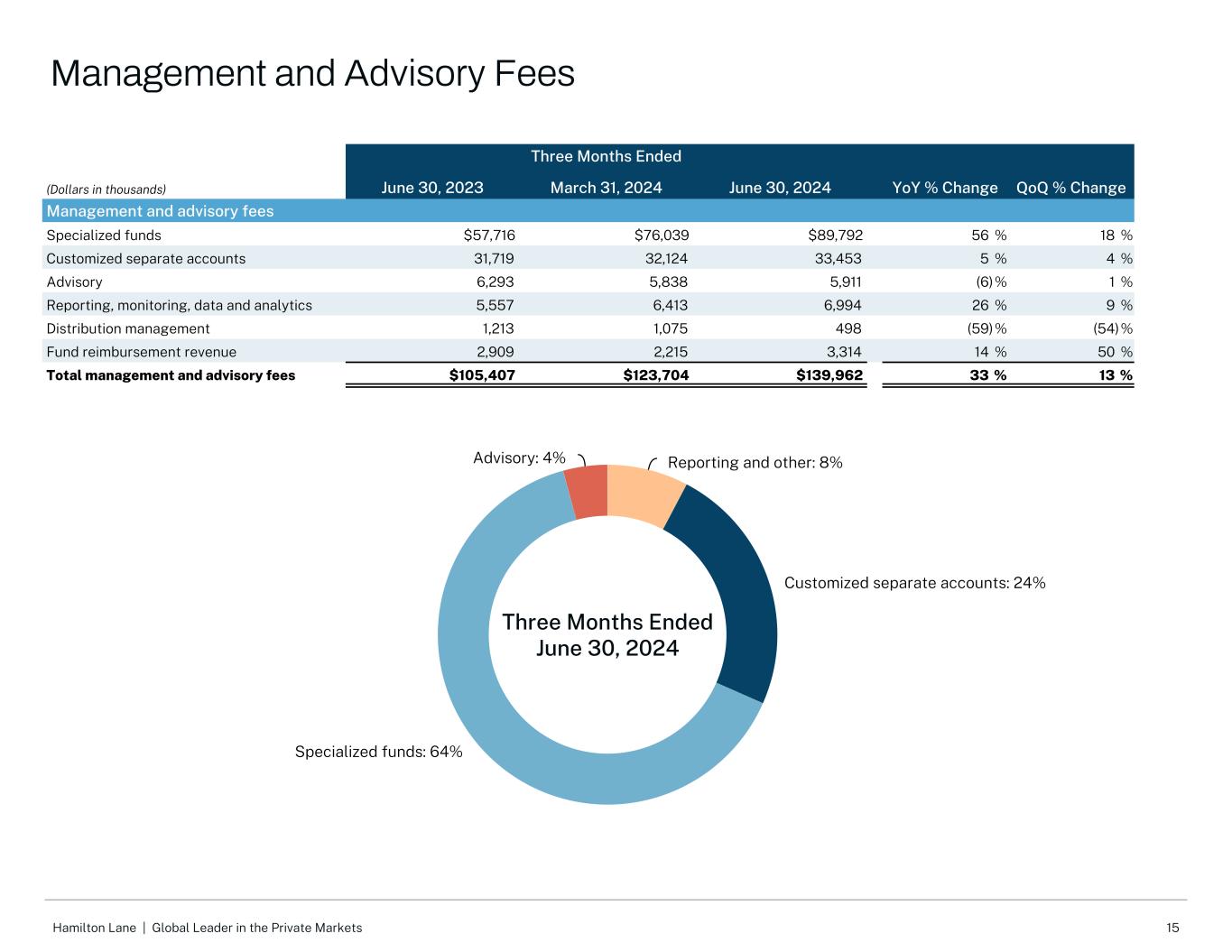 14Hamilton Lane | Global Leader in the Private Markets 1 Adjusted EBITDA and Non-GAAP earnings per share are non-GAAP financial measures. For the reconciliations of our non-GAAP financial measures to the most directly comparable GAAP financial measures, see page 20. 2 Incentive fee related compensation includes incentive fee compensation expense and bonus related to carried interest that is classified as base compensation. 3 Represents corporate income taxes at our estimated statutory tax rate of 23.4% and 23.6% for the three month periods ended June 30, 2024 and 2023, respectively, applied to adjusted pre-tax net income. The 23.4% is based on a federal tax statutory rate of 21.0% and a combined state income tax rate net of federal benefits of 2.4%. The 23.6% is based on a federal tax statutory rate of 21.0% and a combined state income tax rate net of federal benefits of 2.6%. Three Months Ended (Dollars in thousands except share and per share amounts) June 30, 2023 March 31, 2024 June 30, 2024 YoY % Change QoQ % Change Adjusted EBITDA1 Management and advisory fees $105,407 $123,704 $139,962 33 % 13 % Revenue related to consolidated funds 147 — — (100) % N/A Total expenses 70,098 92,778 107,120 53 % 15 % Less: N/A N/A Incentive fee related compensation2 (9,324) (25,157) (26,965) 189 % 7 % Consolidated VIE related general, administrative and other expenses (233) — (312) 34 % N/A Non-operating income related compensation (59) — — N/A N/A Management fee related expenses 60,482 67,621 79,843 32 % 18 % Fee Related Earnings $45,072 $56,083 $60,119 33 % 7 % Fee Related Earnings Margin 43 % 45 % 43 % Incentive fees 19,630 52,961 56,769 189 % 7 % Incentive fees attributable to non-controlling interests — — — N/A N/A Incentive fee related compensation2 (9,324) (25,157) (26,965) 189 % 7 % Non-operating income related compensation (59) — — N/A N/A Interest income 937 1,891 765 (18) % (60) % Equity-based compensation 2,846 2,906 3,223 13 % 11 % Depreciation and amortization 1,873 2,411 2,313 23 % (4) % Adjusted EBITDA $60,975 $91,095 $96,224 58 % 6 % Adjusted EBITDA Margin 49 % 52 % 49 % Non-GAAP earnings per share1 Net income attributable to Hamilton Lane Incorporated $30,998 $48,360 $58,964 90 % 22 % Income attributable to non-controlling interests in Hamilton Lane Advisors, L.L.C. 19,133 28,102 27,645 44 % (2) % Income tax expense 16,400 20,399 19,687 20 % (3) % Adjusted pre-tax net income 66,531 96,861 106,296 60 % 10 % Adjusted income taxes3 (15,701) (22,306) (24,873) 58 % 12 % Adjusted net income $50,830 $74,555 $81,423 60 % 9 % Adjusted shares outstanding 53,855,751 53,994,746 54,049,746 Non-GAAP earnings per share $0.94 $1.38 $1.51 61 % 9 % Non-GAAP Financial Measures