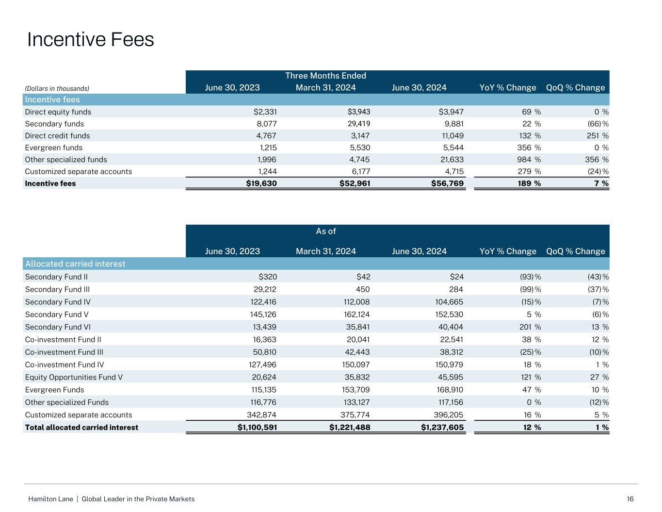 16Hamilton Lane | Global Leader in the Private Markets Three Months Ended (Dollars in thousands) June 30, 2023 March 31, 2024 June 30, 2024 YoY % Change QoQ % Change Incentive fees Direct equity funds $2,331 $3,943 $3,947 69 % 0 % Secondary funds 8,077 29,419 9,881 22 % (66) % Direct credit funds 4,767 3,147 11,049 132 % 251 % Evergreen funds 1,215 5,530 5,544 356 % 0 % Other specialized funds 1,996 4,745 21,633 984 % 356 % Customized separate accounts 1,244 6,177 4,715 279 % (24) % Incentive fees $19,630 $52,961 $56,769 189 % 7 % As of June 30, 2023 March 31, 2024 June 30, 2024 YoY % Change QoQ % Change Allocated carried interest Secondary Fund II $320 $42 $24 (93) % (43) % Secondary Fund III 29,212 450 284 (99) % (37) % Secondary Fund IV 122,416 112,008 104,665 (15) % (7) % Secondary Fund V 145,126 162,124 152,530 5 % (6) % Secondary Fund VI 13,439 35,841 40,404 201 % 13 % Co-investment Fund II 16,363 20,041 22,541 38 % 12 % Co-investment Fund III 50,810 42,443 38,312 (25) % (10) % Co-investment Fund IV 127,496 150,097 150,979 18 % 1 % Equity Opportunities Fund V 20,624 35,832 45,595 121 % 27 % Evergreen Funds 115,135 153,709 168,910 47 % 10 % Other specialized Funds 116,776 133,127 117,156 0 % (12) % Customized separate accounts 342,874 375,774 396,205 16 % 5 % Total allocated carried interest $1,100,591 $1,221,488 $1,237,605 12 % 1 % Incentive Fees