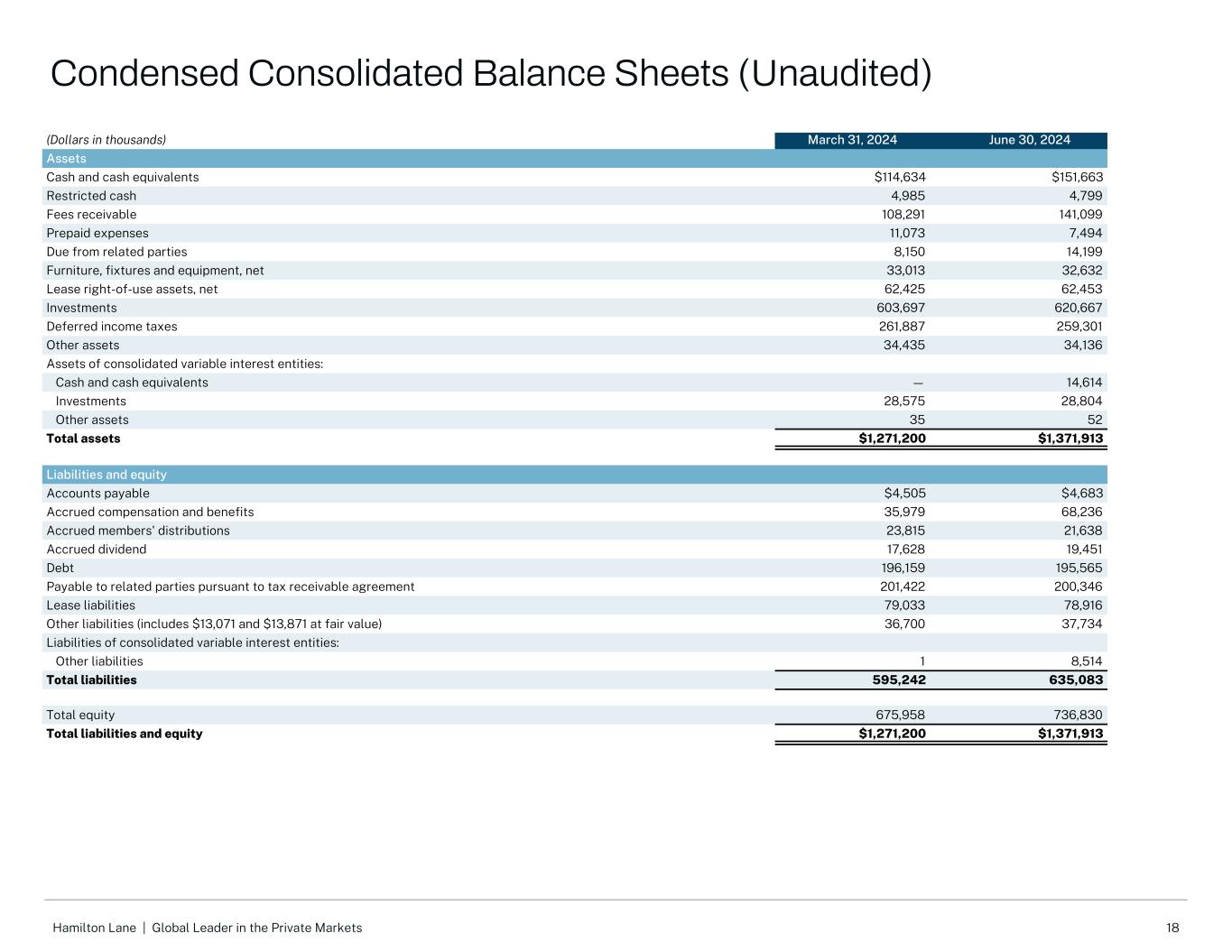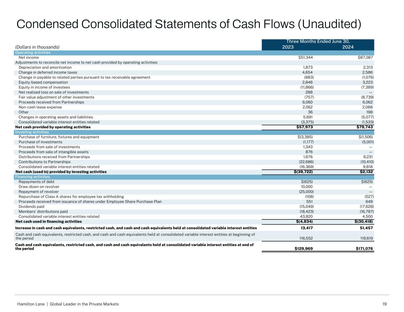 18Hamilton Lane | Global Leader in the Private Markets (Dollars in thousands) March 31, 2024 June 30, 2024 Assets Cash and cash equivalents $114,634 $151,663 Restricted cash 4,985 4,799 Fees receivable 108,291 141,099 Prepaid expenses 11,073 7,494 Due from related parties 8,150 14,199 Furniture, fixtures and equipment, net 33,013 32,632 Lease right-of-use assets, net 62,425 62,453 Investments 603,697 620,667 Deferred income taxes 261,887 259,301 Other assets 34,435 34,136 Assets of consolidated variable interest entities: Cash and cash equivalents — 14,614 Investments 28,575 28,804 Other assets 35 52 Total assets $1,271,200 $1,371,913 Liabilities and equity Accounts payable $4,505 $4,683 Accrued compensation and benefits 35,979 68,236 Accrued members' distributions 23,815 21,638 Accrued dividend 17,628 19,451 Debt 196,159 195,565 Payable to related parties pursuant to tax receivable agreement 201,422 200,346 Lease liabilities 79,033 78,916 Other liabilities (includes $13,071 and $13,871 at fair value) 36,700 37,734 Liabilities of consolidated variable interest entities: Other liabilities 1 8,514 Total liabilities 595,242 635,083 Total equity 675,958 736,830 Total liabilities and equity $1,271,200 $1,371,913 Condensed Consolidated Balance Sheets (Unaudited)