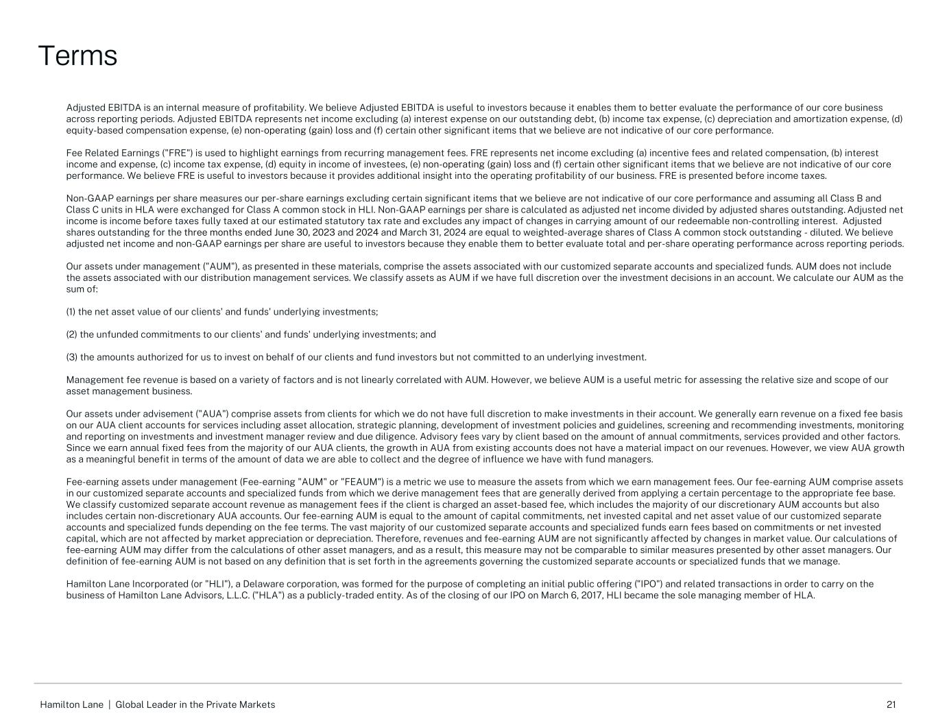 20Hamilton Lane | Global Leader in the Private Markets Reconciliation from Net Income Year Ended March 31, Three Months Ended (Dollars in thousands except share and per share amounts) 2019 2024 June 30, 2023 March 31, 2024 June 30, 2024 Net income attributable to Hamilton Lane Incorporated $33,573 $140,858 $30,998 $48,360 $58,964 Income attributable to non-controlling interests in general partnerships 564 534 1 363 346 Income attributable to non-controlling interests in Hamilton Lane Advisors, L.L.C. 64,860 80,835 19,133 28,102 27,645 Income attributable to non-controlling interests in consolidated funds — 4,980 1,212 — 132 Incentive fees (34,406) (101,906) (19,630) (52,961) (56,769) Incentive fee related compensation1 14,983 48,406 9,324 25,157 26,965 Consolidated VIE related general, administrative and other expenses — 566 233 — 312 Revenue related to consolidated funds — 394 147 — — Non-operating income related compensation — 59 59 — — Interest income (255) (10,008) (2,677) (1,891) (782) Interest expense 3,039 11,175 2,896 2,788 2,947 Income tax expense 30,560 54,454 16,400 20,399 19,687 Equity in (income) of investees (7,202) (36,491) (11,998) (15,760) (8,317) Contingent compensation related to acquisition 5,100 — — — — Non-operating (gain) loss (20,915) (519) (1,026) 1,526 (11,011) Fee Related Earnings $89,901 $193,337 $45,072 $56,083 $60,119 Depreciation and amortization 2,500 8,186 1,873 2,411 2,313 Equity-based compensation 6,382 12,133 2,846 2,906 3,223 Incentive fees 34,406 101,906 19,630 52,961 56,769 Incentive fees attributable to non-controlling interests (725) — — — — Incentive fee related compensation1 (14,983) (48,406) (9,324) (25,157) (26,965) Non-operating income related compensation — (59) (59) — — Interest income 255 5,427 937 1,891 765 Adjusted EBITDA $117,736 $272,524 $60,975 $91,095 $96,224 Non-GAAP earnings per share reconciliation Net income attributable to Hamilton Lane Incorporated $30,998 $48,360 $58,964 Income attributable to non-controlling interests in Hamilton Lane Advisors, L.L.C. 19,133 28,102 27,645 Income tax expense 16,400 20,399 19,687 Adjusted pre-tax net income 66,531 96,861 106,296 Adjusted income taxes2 (15,701) (22,306) (24,873) Adjusted net income $50,830 $74,555 $81,423 Adjusted shares outstanding 53,855,751 53,994,746 54,049,746 Non-GAAP earnings per share $0.94 $1.38 $1.51 1 Incentive fee related compensation includes incentive fee compensation expense and bonus related to carried interest that is classified as base compensation. 2 Represents corporate income taxes at our estimated statutory tax rate of 23.4% and 23.6% for the three month periods ended June 30, 2024 and 2023, respectively, applied to adjusted pre-tax net income. The 23.4% is based on a federal tax statutory rate of 21.0% and a combined state income tax rate net of federal benefits of 2.4%. The 23.6% is based on a federal tax statutory rate of 21.0% and a combined state income tax rate net of federal benefits of 2.6%. Non-GAAP Reconciliation
