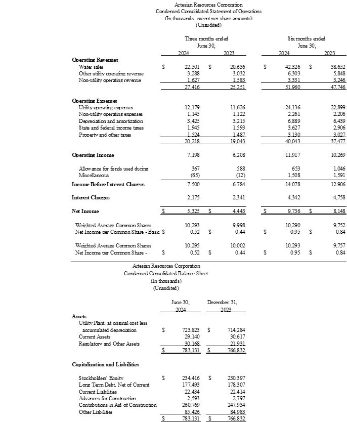 Resources Corporation (Nasdaq: ARTNA), a leading provider on the Delmarva Peninsula of water and wastewater services, and a number of other related business services, today announced second quarter and year-to-date results for 2024.