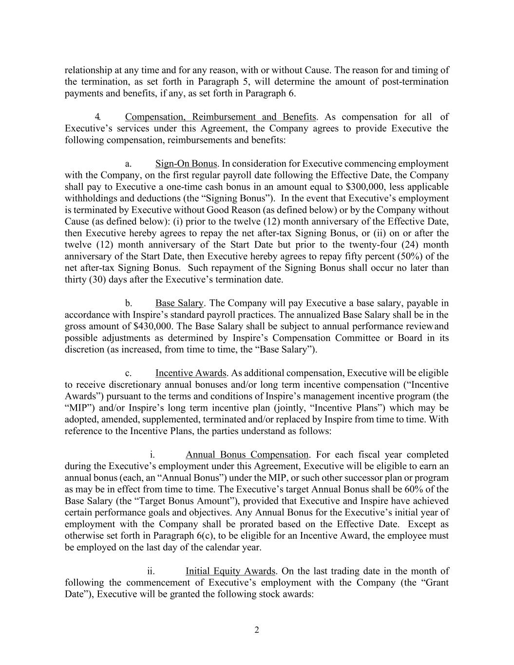 2 relationship at any time and for any reason, with or without Cause. The reason for and timing of the termination, as set forth in Paragraph 5, will determine the amount of post-termination payments and benefits, if any, as set forth in Paragraph 6. 4. Compensation, Reimbursement and Benefits. As compensation for all of Executive’s services under this Agreement, the Company agrees to provide Executive the following compensation, reimbursements and benefits: a. Sign-On Bonus. In consideration for Executive commencing employment with the Company, on the first regular payroll date following the Effective Date, the Company shall pay to Executive a one-time cash bonus in an amount equal to $300,000, less applicable withholdings and deductions (the “Signing Bonus”). In the event that Executive’s employment is terminated by Executive without Good Reason (as defined below) or by the Company without Cause (as defined below): (i) prior to the twelve (12) month anniversary of the Effective Date, then Executive hereby agrees to repay the net after-tax Signing Bonus, or (ii) on or after the twelve (12) month anniversary of the Start Date but prior to the twenty-four (24) month anniversary of the Start Date, then Executive hereby agrees to repay fifty percent (50%) of the net after-tax Signing Bonus. Such repayment of the Signing Bonus shall occur no later than thirty (30) days after the Executive’s termination date. b. Base Salary. The Company will pay Executive a base salary, payable in accordance with Inspire’s standard payroll practices. The annualized Base Salary shall be in the gross amount of $430,000. The Base Salary shall be subject to annual performance review and possible adjustments as determined by Inspire’s Compensation Committee or Board in its discretion (as increased, from time to time, the “Base Salary”). c. Incentive Awards. As additional compensation, Executive will be eligible to receive discretionary annual bonuses and/or long term incentive compensation (“Incentive Awards”) pursuant to the terms and conditions of Inspire’s management incentive program (the “MIP”) and/or Inspire’s long term incentive plan (jointly, “Incentive Plans”) which may be adopted, amended, supplemented, terminated and/or replaced by Inspire from time to time. With reference to the Incentive Plans, the parties understand as follows: i. Annual Bonus Compensation. For each fiscal year completed during the Executive’s employment under this Agreement, Executive will be eligible to earn an annual bonus (each, an “Annual Bonus”) under the MIP, or such other successor plan or program as may be in effect from time to time. The Executive’s target Annual Bonus shall be 60% of the Base Salary (the “Target Bonus Amount”), provided that Executive and Inspire have achieved certain performance goals and objectives. Any Annual Bonus for the Executive’s initial year of employment with the Company shall be prorated based on the Effective Date. Except as otherwise set forth in Paragraph 6(c), to be eligible for an Incentive Award, the employee must be employed on the last day of the calendar year. ii. Initial Equity Awards. On the last trading date in the month of following the commencement of Executive’s employment with the Company (the “Grant Date”), Executive will be granted the following stock awards: