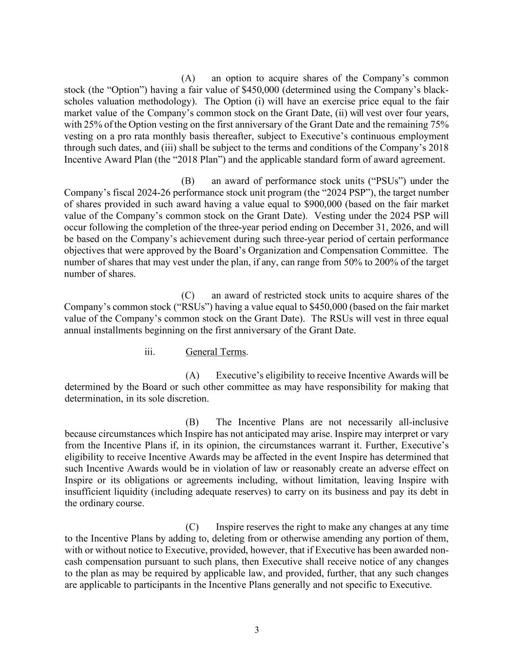 3 (A) an option to acquire shares of the Company’s common stock (the “Option”) having a fair value of $450,000 (determined using the Company’s black- scholes valuation methodology). The Option (i) will have an exercise price equal to the fair market value of the Company’s common stock on the Grant Date, (ii) will vest over four years, with 25% of the Option vesting on the first anniversary of the Grant Date and the remaining 75% vesting on a pro rata monthly basis thereafter, subject to Executive’s continuous employment through such dates, and (iii) shall be subject to the terms and conditions of the Company’s 2018 Incentive Award Plan (the “2018 Plan”) and the applicable standard form of award agreement. (B) an award of performance stock units (“PSUs”) under the Company’s fiscal 2024-26 performance stock unit program (the “2024 PSP”), the target number of shares provided in such award having a value equal to $900,000 (based on the fair market value of the Company’s common stock on the Grant Date). Vesting under the 2024 PSP will occur following the completion of the three-year period ending on December 31, 2026, and will be based on the Company’s achievement during such three-year period of certain performance objectives that were approved by the Board’s Organization and Compensation Committee. The number of shares that may vest under the plan, if any, can range from 50% to 200% of the target number of shares. (C) an award of restricted stock units to acquire shares of the Company’s common stock (“RSUs”) having a value equal to $450,000 (based on the fair market value of the Company’s common stock on the Grant Date). The RSUs will vest in three equal annual installments beginning on the first anniversary of the Grant Date. iii. General Terms. (A) Executive’s eligibility to receive Incentive Awards will be determined by the Board or such other committee as may have responsibility for making that determination, in its sole discretion. (B) The Incentive Plans are not necessarily all-inclusive because circumstances which Inspire has not anticipated may arise. Inspire may interpret or vary from the Incentive Plans if, in its opinion, the circumstances warrant it. Further, Executive’s eligibility to receive Incentive Awards may be affected in the event Inspire has determined that such Incentive Awards would be in violation of law or reasonably create an adverse effect on Inspire or its obligations or agreements including, without limitation, leaving Inspire with insufficient liquidity (including adequate reserves) to carry on its business and pay its debt in the ordinary course. (C) Inspire reserves the right to make any changes at any time to the Incentive Plans by adding to, deleting from or otherwise amending any portion of them, with or without notice to Executive, provided, however, that if Executive has been awarded non- cash compensation pursuant to such plans, then Executive shall receive notice of any changes to the plan as may be required by applicable law, and provided, further, that any such changes are applicable to participants in the Incentive Plans generally and not specific to Executive.