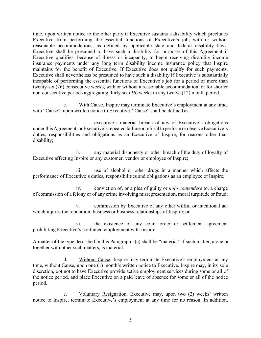 5 time, upon written notice to the other party if Executive sustains a disability which precludes Executive from performing the essential functions of Executive’s job, with or without reasonable accommodations, as defined by applicable state and federal disability laws. Executive shall be presumed to have such a disability for purposes of this Agreement if Executive qualifies, because of illness or incapacity, to begin receiving disability income insurance payments under any long term disability income insurance policy that Inspire maintains for the benefit of Executive. If Executive does not qualify for such payments, Executive shall nevertheless be presumed to have such a disability if Executive is substantially incapable of performing the essential functions of Executive’s job for a period of more than twenty-six (26) consecutive weeks, with or without a reasonable accommodation, or for shorter non-consecutive periods aggregating thirty six (36) weeks in any twelve (12) month period. c. With Cause. Inspire may terminate Executive’s employment at any time, with “Cause”, upon written notice to Executive. “Cause” shall be defined as: i. executive’s material breach of any of Executive’s obligations under this Agreement, or Executive’s repeated failure or refusal to perform or observe Executive’s duties, responsibilities and obligations as an Executive of Inspire, for reasons other than disability; ii. any material dishonesty or other breach of the duty of loyalty of Executive affecting Inspire or any customer, vendor or employee of Inspire; iii. use of alcohol or other drugs in a manner which affects the performance of Executive’s duties, responsibilities and obligations as an employee of Inspire; iv. conviction of, or a plea of guilty or nolo contendere to, a charge of commission of a felony or of any crime involving misrepresentation, moral turpitude or fraud; v. commission by Executive of any other willful or intentional act which injures the reputation, business or business relationships of Inspire; or vi. the existence of any court order or settlement agreement prohibiting Executive’s continued employment with Inspire. A matter of the type described in this Paragraph 5(c) shall be “material” if such matter, alone or together with other such matters, is material. d. Without Cause. Inspire may terminate Executive’s employment at any time, without Cause, upon one (1) month’s written notice to Executive. Inspire may, in its sole discretion, opt not to have Executive provide active employment services during some or all of the notice period, and place Executive on a paid leave of absence for some or all of the notice period. e. Voluntary Resignation. Executive may, upon two (2) weeks’ written notice to Inspire, terminate Executive’s employment at any time for no reason. In addition,