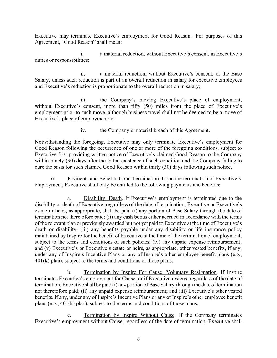 6 Executive may terminate Executive’s employment for Good Reason. For purposes of this Agreement, “Good Reason” shall mean: i. a material reduction, without Executive’s consent, in Executive’s duties or responsibilities; ii. a material reduction, without Executive’s consent, of the Base Salary, unless such reduction is part of an overall reduction in salary for executive employees and Executive’s reduction is proportionate to the overall reduction in salary; iii. the Company’s moving Executive’s place of employment, without Executive’s consent, more than fifty (50) miles from the place of Executive’s employment prior to such move, although business travel shall not be deemed to be a move of Executive’s place of employment; or iv. the Company’s material breach of this Agreement. Notwithstanding the foregoing, Executive may only terminate Executive’s employment for Good Reason following the occurrence of one or more of the foregoing conditions, subject to Executive first providing written notice of Executive’s claimed Good Reason to the Company within ninety (90) days after the initial existence of such condition and the Company failing to cure the basis for such claimed Good Reason within thirty (30) days following such notice. 6. Payments and Benefits Upon Termination. Upon the termination of Executive’s employment, Executive shall only be entitled to the following payments and benefits: a. Disability; Death. If Executive’s employment is terminated due to the disability or death of Executive, regardless of the date of termination, Executive or Executive’s estate or heirs, as appropriate, shall be paid (i) any portion of Base Salary through the date of termination not theretofore paid; (ii) any cash bonus either accrued in accordance with the terms of the relevant plan or previously awarded but not yet paid to Executive at the time of Executive’s death or disability; (iii) any benefits payable under any disability or life insurance policy maintained by Inspire for the benefit of Executive at the time of the termination of employment, subject to the terms and conditions of such policies; (iv) any unpaid expense reimbursement; and (v) Executive’s or Executive’s estate or heirs, as appropriate, other vested benefits, if any, under any of Inspire’s Incentive Plans or any of Inspire’s other employee benefit plans (e.g., 401(k) plan), subject to the terms and conditions of those plans. b. Termination by Inspire For Cause; Voluntary Resignation. If Inspire terminates Executive’s employment for Cause, or if Executive resigns, regardless of the date of termination, Executive shall be paid (i) any portion of Base Salary through the date of termination not theretofore paid; (ii) any unpaid expense reimbursement; and (iii) Executive’s other vested benefits, if any, under any of Inspire’s Incentive Plans or any of Inspire’s other employee benefit plans (e.g., 401(k) plan), subject to the terms and conditions of those plans. c. Termination by Inspire Without Cause. If the Company terminates Executive’s employment without Cause, regardless of the date of termination, Executive shall