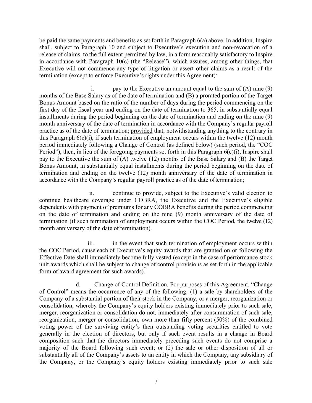 7 be paid the same payments and benefits as set forth in Paragraph 6(a) above. In addition, Inspire shall, subject to Paragraph 10 and subject to Executive’s execution and non-revocation of a release of claims, to the full extent permitted by law, in a form reasonably satisfactory to Inspire in accordance with Paragraph 10(c) (the “Release”), which assures, among other things, that Executive will not commence any type of litigation or assert other claims as a result of the termination (except to enforce Executive’s rights under this Agreement): i. pay to the Executive an amount equal to the sum of (A) nine (9) months of the Base Salary as of the date of termination and (B) a prorated portion of the Target Bonus Amount based on the ratio of the number of days during the period commencing on the first day of the fiscal year and ending on the date of termination to 365, in substantially equal installments during the period beginning on the date of termination and ending on the nine (9) month anniversary of the date of termination in accordance with the Company’s regular payroll practice as of the date of termination; provided that, notwithstanding anything to the contrary in this Paragraph 6(c)(i), if such termination of employment occurs within the twelve (12) month period immediately following a Change of Control (as defined below) (such period, the “COC Period”), then, in lieu of the foregoing payments set forth in this Paragraph 6(c)(i), Inspire shall pay to the Executive the sum of (A) twelve (12) months of the Base Salary and (B) the Target Bonus Amount, in substantially equal installments during the period beginning on the date of termination and ending on the twelve (12) month anniversary of the date of termination in accordance with the Company’s regular payroll practice as of the date of termination; ii. continue to provide, subject to the Executive’s valid election to continue healthcare coverage under COBRA, the Executive and the Executive’s eligible dependents with payment of premiums for any COBRA benefits during the period commencing on the date of termination and ending on the nine (9) month anniversary of the date of termination (if such termination of employment occurs within the COC Period, the twelve (12) month anniversary of the date of termination). iii. in the event that such termination of employment occurs within the COC Period, cause each of Executive’s equity awards that are granted on or following the Effective Date shall immediately become fully vested (except in the case of performance stock unit awards which shall be subject to change of control provisions as set forth in the applicable form of award agreement for such awards). d. Change of Control Definition. For purposes of this Agreement, “Change of Control” means the occurrence of any of the following: (1) a sale by shareholders of the Company of a substantial portion of their stock in the Company, or a merger, reorganization or consolidation, whereby the Company’s equity holders existing immediately prior to such sale, merger, reorganization or consolidation do not, immediately after consummation of such sale, reorganization, merger or consolidation, own more than fifty percent (50%) of the combined voting power of the surviving entity’s then outstanding voting securities entitled to vote generally in the election of directors, but only if such event results in a change in Board composition such that the directors immediately preceding such events do not comprise a majority of the Board following such event; or (2) the sale or other disposition of all or substantially all of the Company’s assets to an entity in which the Company, any subsidiary of the Company, or the Company’s equity holders existing immediately prior to such sale