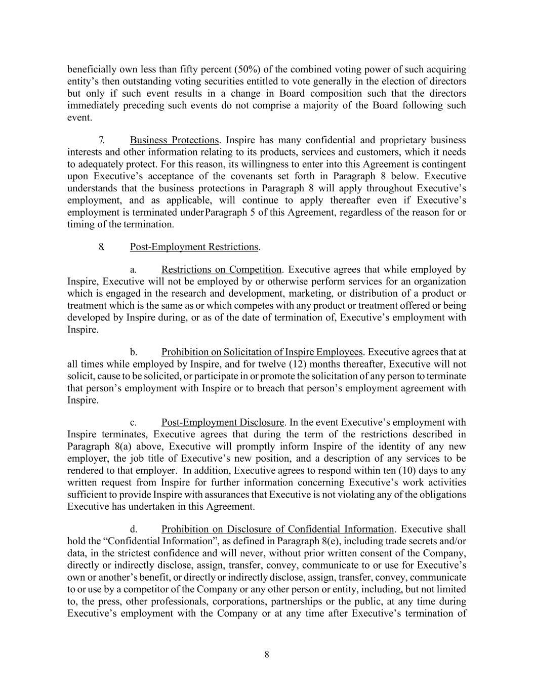 8 beneficially own less than fifty percent (50%) of the combined voting power of such acquiring entity’s then outstanding voting securities entitled to vote generally in the election of directors but only if such event results in a change in Board composition such that the directors immediately preceding such events do not comprise a majority of the Board following such event. 7. Business Protections. Inspire has many confidential and proprietary business interests and other information relating to its products, services and customers, which it needs to adequately protect. For this reason, its willingness to enter into this Agreement is contingent upon Executive’s acceptance of the covenants set forth in Paragraph 8 below. Executive understands that the business protections in Paragraph 8 will apply throughout Executive’s employment, and as applicable, will continue to apply thereafter even if Executive’s employment is terminated under Paragraph 5 of this Agreement, regardless of the reason for or timing of the termination. 8. Post-Employment Restrictions. a. Restrictions on Competition. Executive agrees that while employed by Inspire, Executive will not be employed by or otherwise perform services for an organization which is engaged in the research and development, marketing, or distribution of a product or treatment which is the same as or which competes with any product or treatment offered or being developed by Inspire during, or as of the date of termination of, Executive’s employment with Inspire. b. Prohibition on Solicitation of Inspire Employees. Executive agrees that at all times while employed by Inspire, and for twelve (12) months thereafter, Executive will not solicit, cause to be solicited, or participate in or promote the solicitation of any person to terminate that person’s employment with Inspire or to breach that person’s employment agreement with Inspire. c. Post-Employment Disclosure. In the event Executive’s employment with Inspire terminates, Executive agrees that during the term of the restrictions described in Paragraph 8(a) above, Executive will promptly inform Inspire of the identity of any new employer, the job title of Executive’s new position, and a description of any services to be rendered to that employer. In addition, Executive agrees to respond within ten (10) days to any written request from Inspire for further information concerning Executive’s work activities sufficient to provide Inspire with assurances that Executive is not violating any of the obligations Executive has undertaken in this Agreement. d. Prohibition on Disclosure of Confidential Information. Executive shall hold the “Confidential Information”, as defined in Paragraph 8(e), including trade secrets and/or data, in the strictest confidence and will never, without prior written consent of the Company, directly or indirectly disclose, assign, transfer, convey, communicate to or use for Executive’s own or another’s benefit, or directly or indirectly disclose, assign, transfer, convey, communicate to or use by a competitor of the Company or any other person or entity, including, but not limited to, the press, other professionals, corporations, partnerships or the public, at any time during Executive’s employment with the Company or at any time after Executive’s termination of
